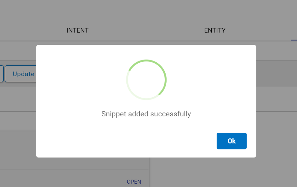 - On clicking + Add the selected flow snippet components (Intents, Entities, Dialog Nodes) would be added to the current skill and training will be triggered. On successful addition of selected components, the following modal will appear: