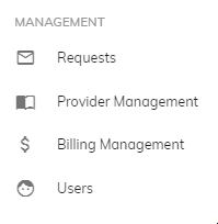 Management This section describes how to manage users, providers, providers’ billing templates, and requests generated for support. Only the super admin can access, view, and manage this console. It includes the following sub-sections: Requests Providers Management Billing Management Users Figure 1. Management Console