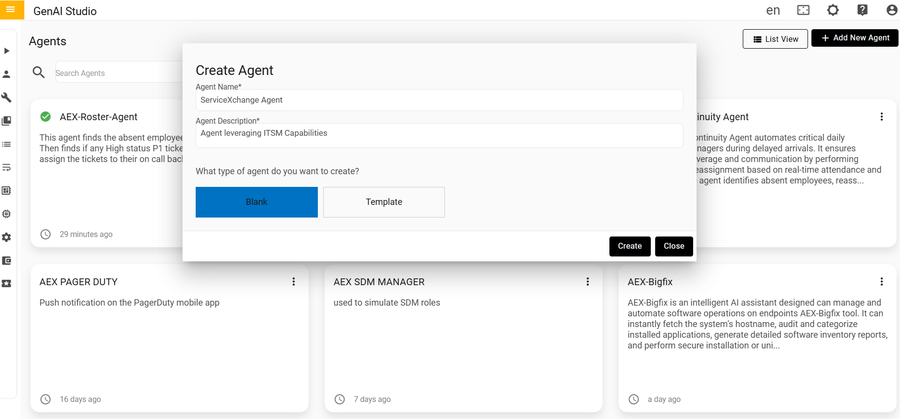 Blank A Blank Agent type is an agent that starts without any predefined instructions, tools, or roles, allowing full customization of its behavior, purpose, and capabilities. Click the create button.Figure 1. Blank Agent Type