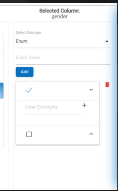 In the above image, column “status” is defined as “Enum”, and the values that are predefined and appended to it from the database, i.e. “male”,” female” are listed out. Clicking any of the Enum value will open the collapsible menu, and the user can add synonyms of the Enum values there.