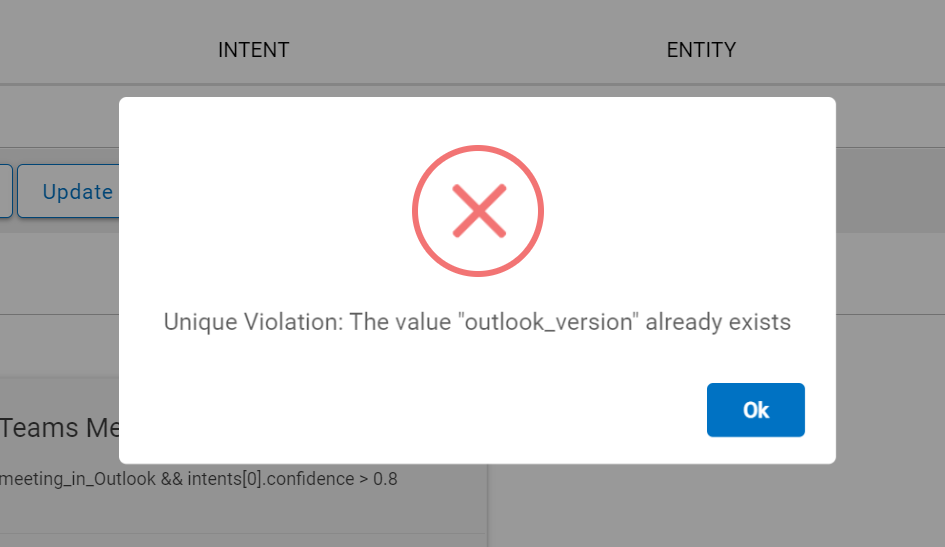 - If any of the components (such as Intents, Entities or Dialog Nodes) already exist, the UCD console will show the following warning, in this case the imported components might need to be changed before adding the new flow snippet as entities are sometimes shared between flow snippets and this is to avoid duplication of values.