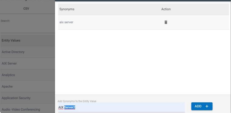 - Using the search bar, search for the Entity for which you want to remove the synonym.
