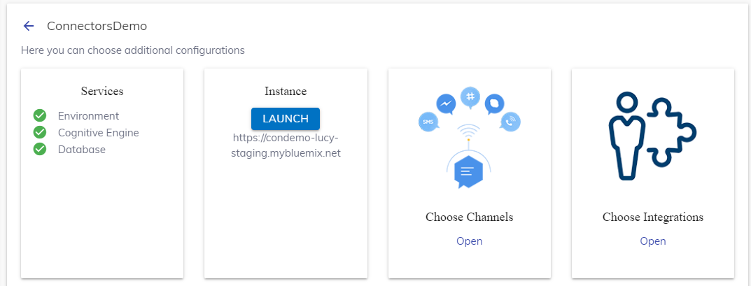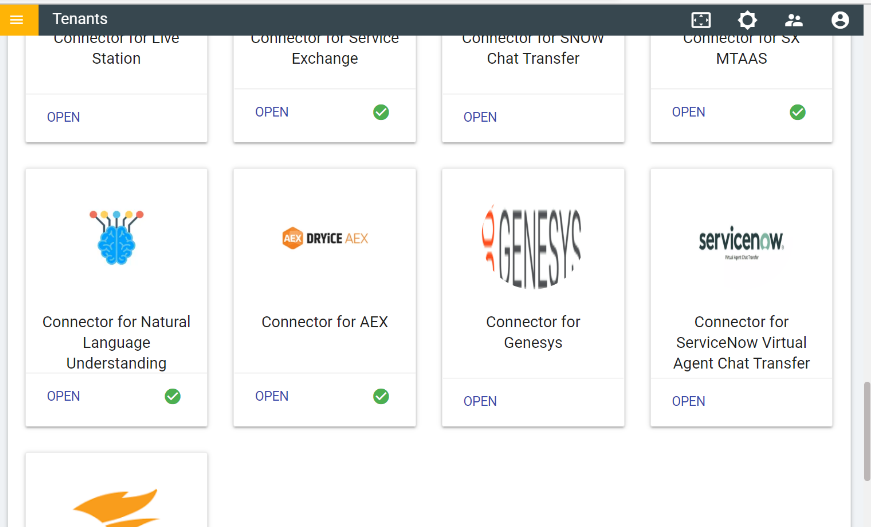 button in Actions column. - In Tenant’s Configuration page, click on open in Choose Integrations card.