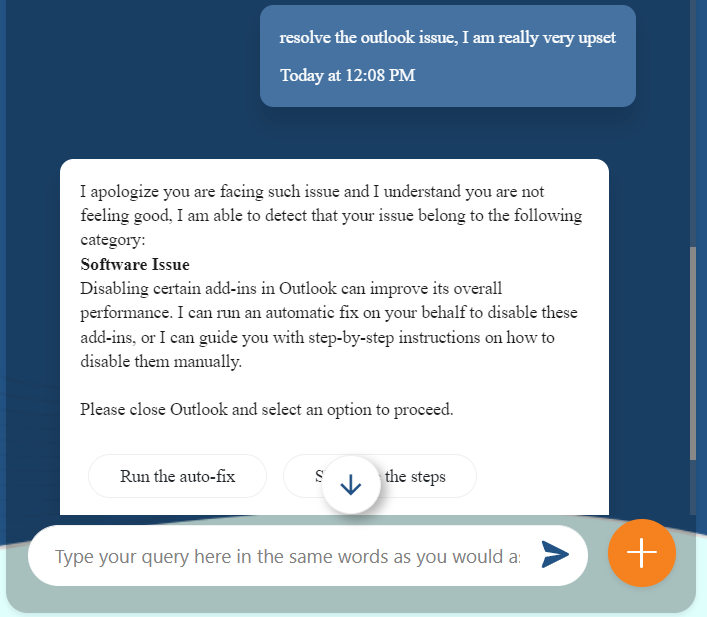 If the emotion does not exceed the confidence score of 0.5, the response is normal, but for a query from an angry user, the user gets a polite calming advise from BigFix AEX.
