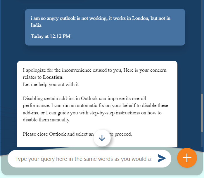 Note:‘I apologize you are facing such issue and you are not feeling good because of this issue, what I am able to detect your issue belongs to one of following category:<br><b> <? T(String).join(", ",($nlu.categories.filter("category", "category.score> 0.6")).![label]) ?> </b><br><br>you may find this article relevant<a href=" <? T(String).join(",",($nlu.concepts.filter("concept","concept.relevance>0.7")).![dbpedia_resource])?>"> <? T(String).join(",",($nlu.concepts.filter("concept","concept.relevance>0.7")).![text])?></a><br>let me help you out with it<br><br>Disabling certain add-ins in Outlook can improve its overall performance. I can run an automatic fix on your behalf to disable these add-ins, or I can guide you with step-by-step instructions on how to disable them manually. <br><br>