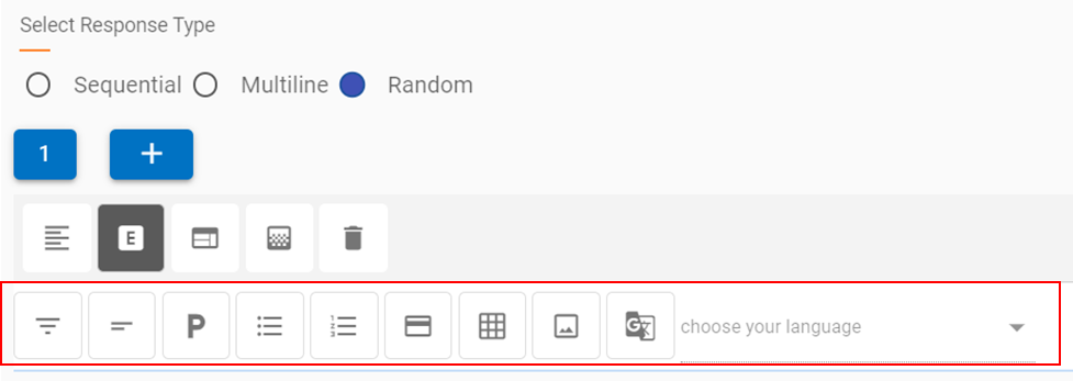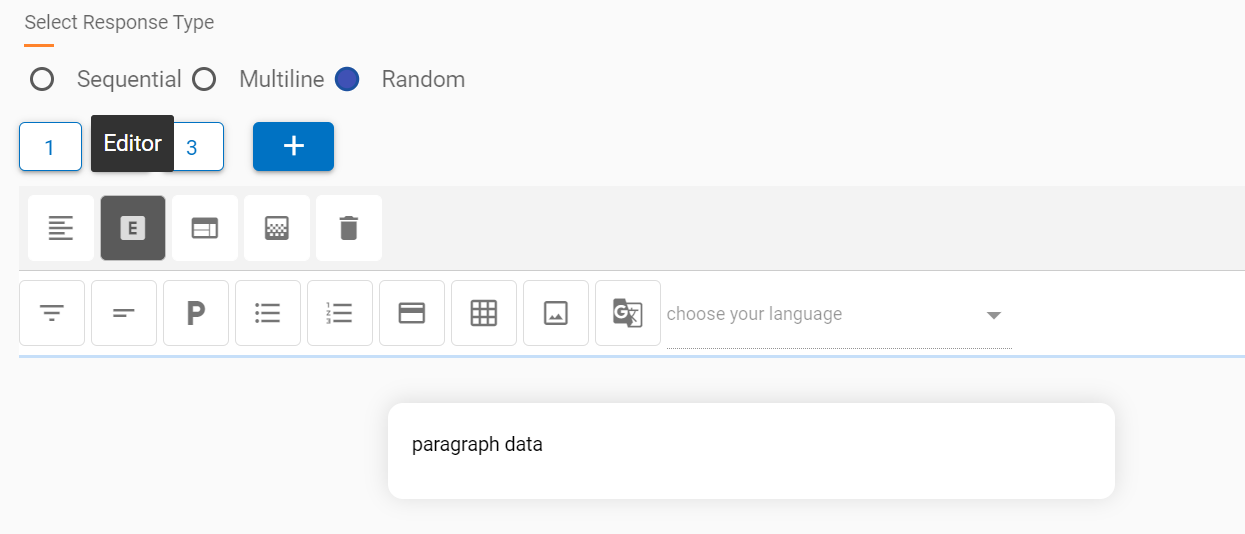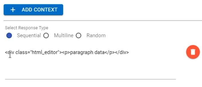 Random: Responses are shown randomly from the list of responses when a node is executed. Response blocks can be added by using the + icon below the response type radio button. On adding a new response, the editor changes the focus to the latest response.