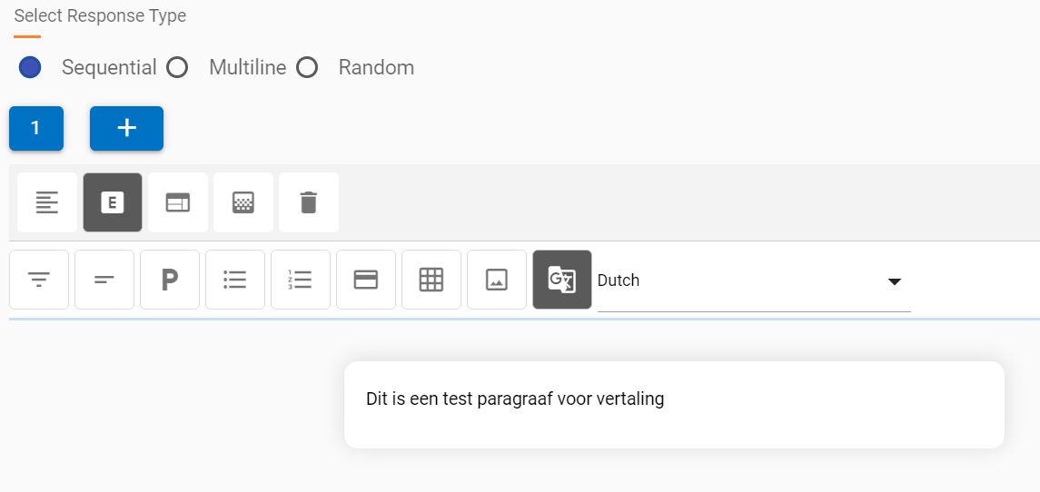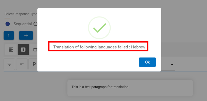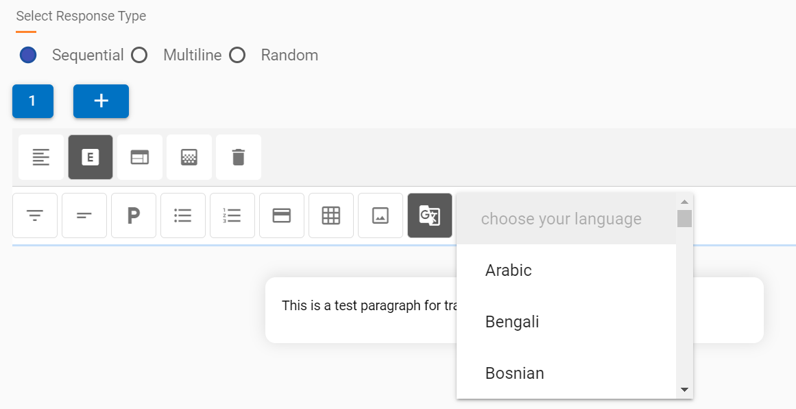 - To use this functionality, after a response block is suitable for translation, the user needs to click on the translate component button and wait for the window to confirm the translation is done. In the following image, the translation component is translating the statement “This is a test paragraph for translation.”