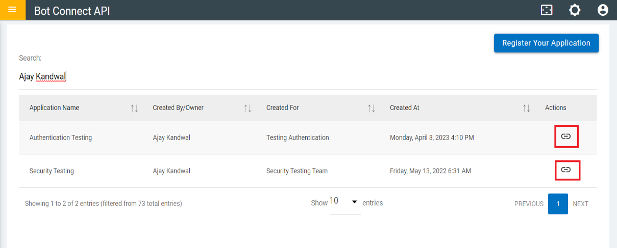 - The figure below depicts the Bot Connect API form after creating one. User needs to