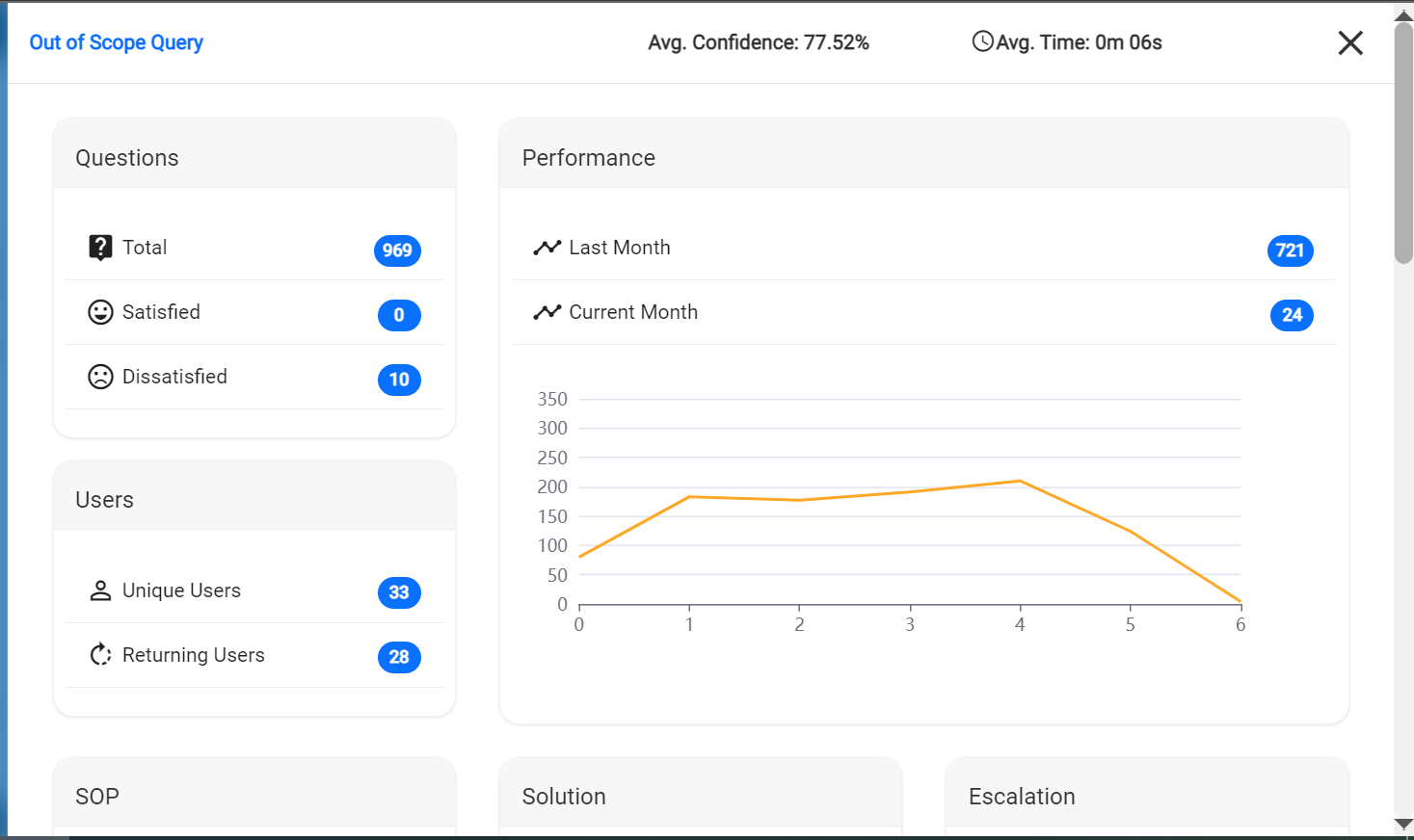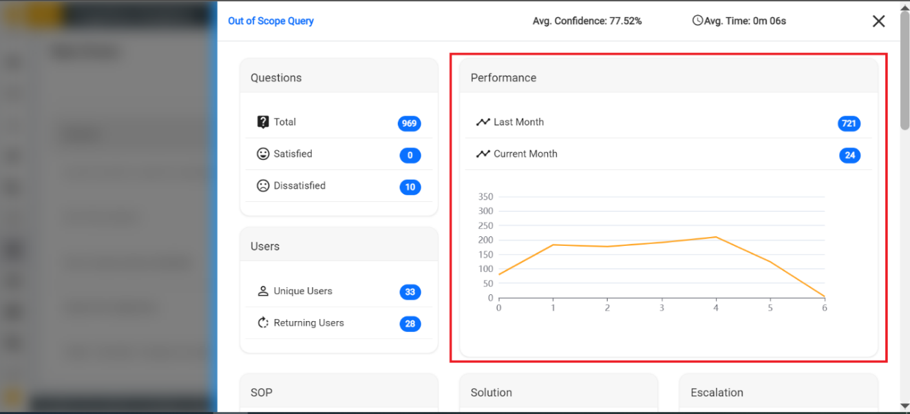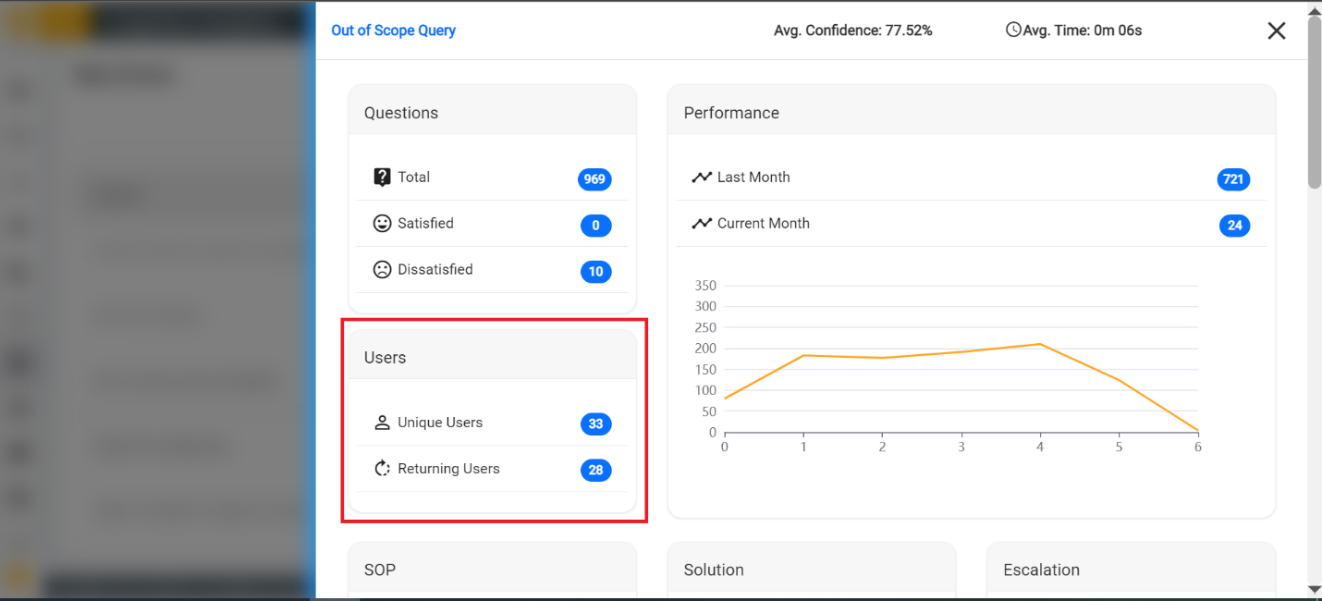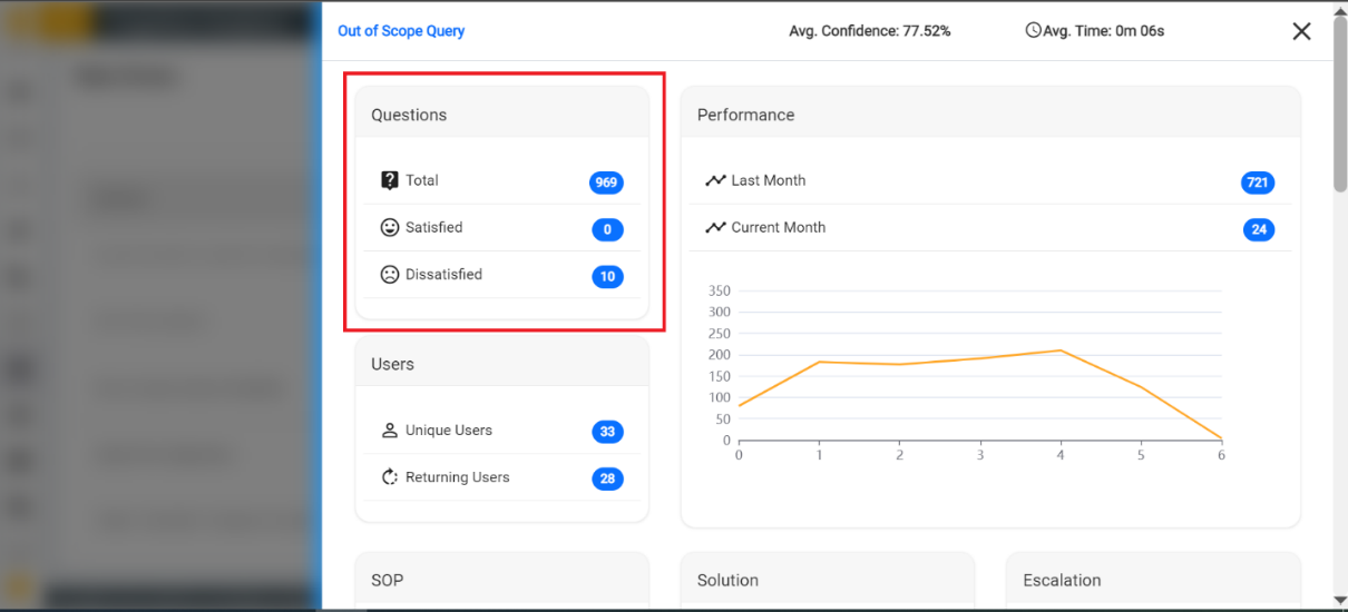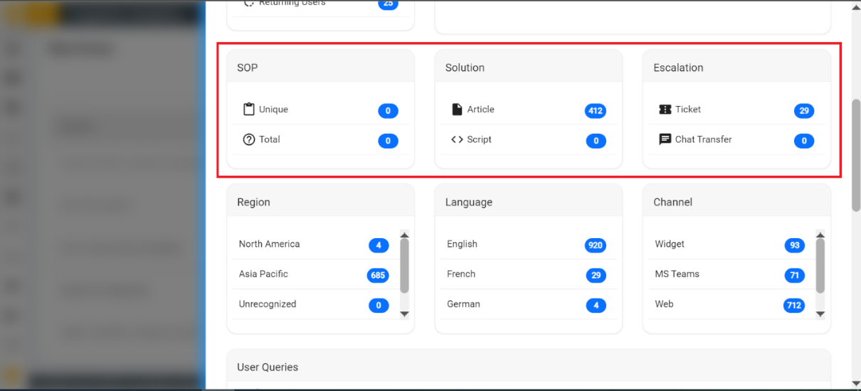 - SOP: Unique count and total number of times when an SOP (Standard Operating Procedure) is triggered in response to users for a specific query.