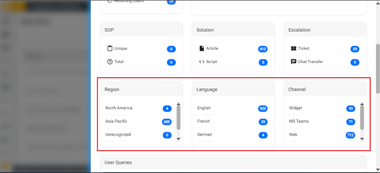 - Count of channel, domain, language, region, and customer from which the user has raised their queries.