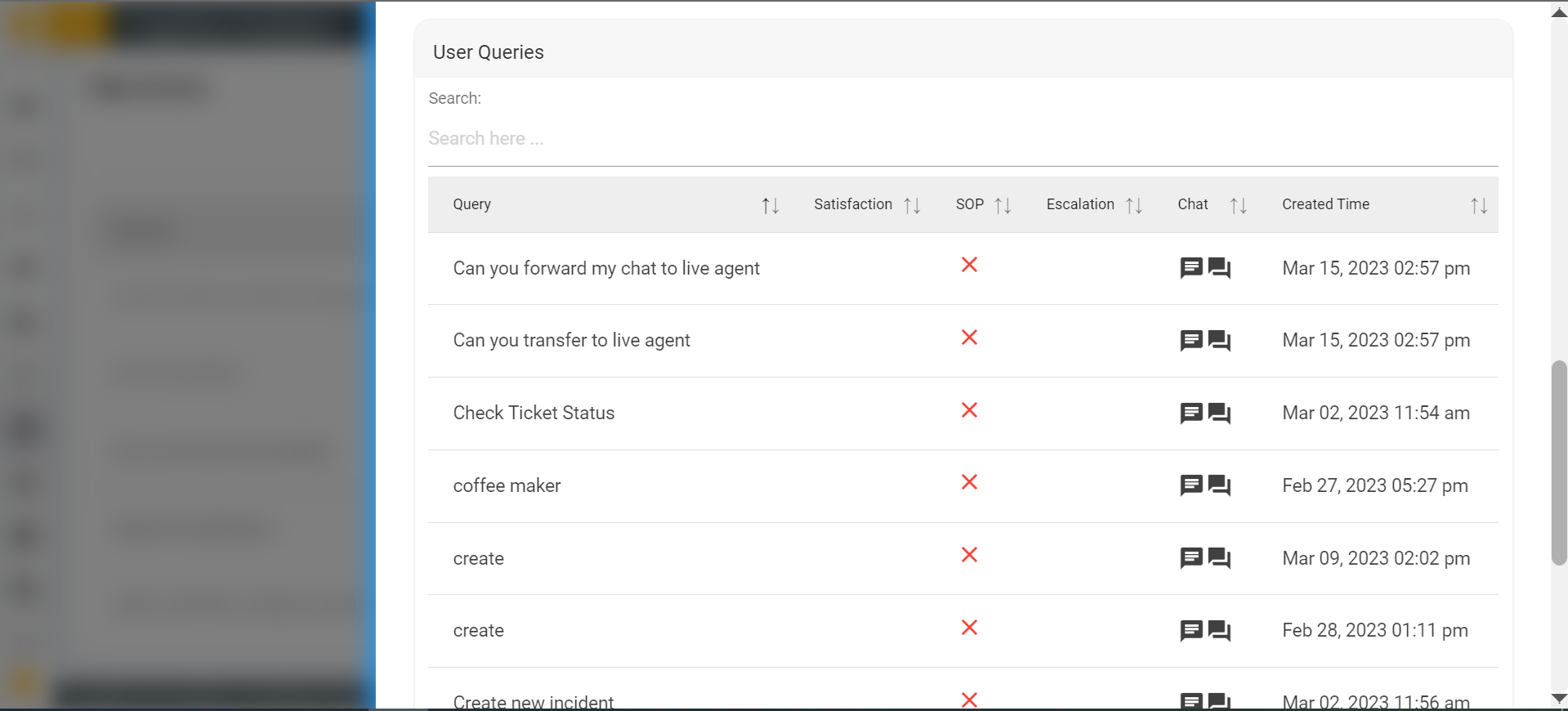 - The table represents the list of queries, satisfaction result, whether SOP is