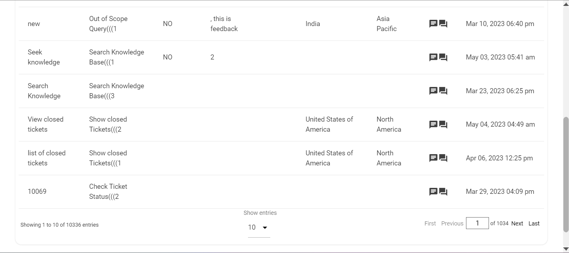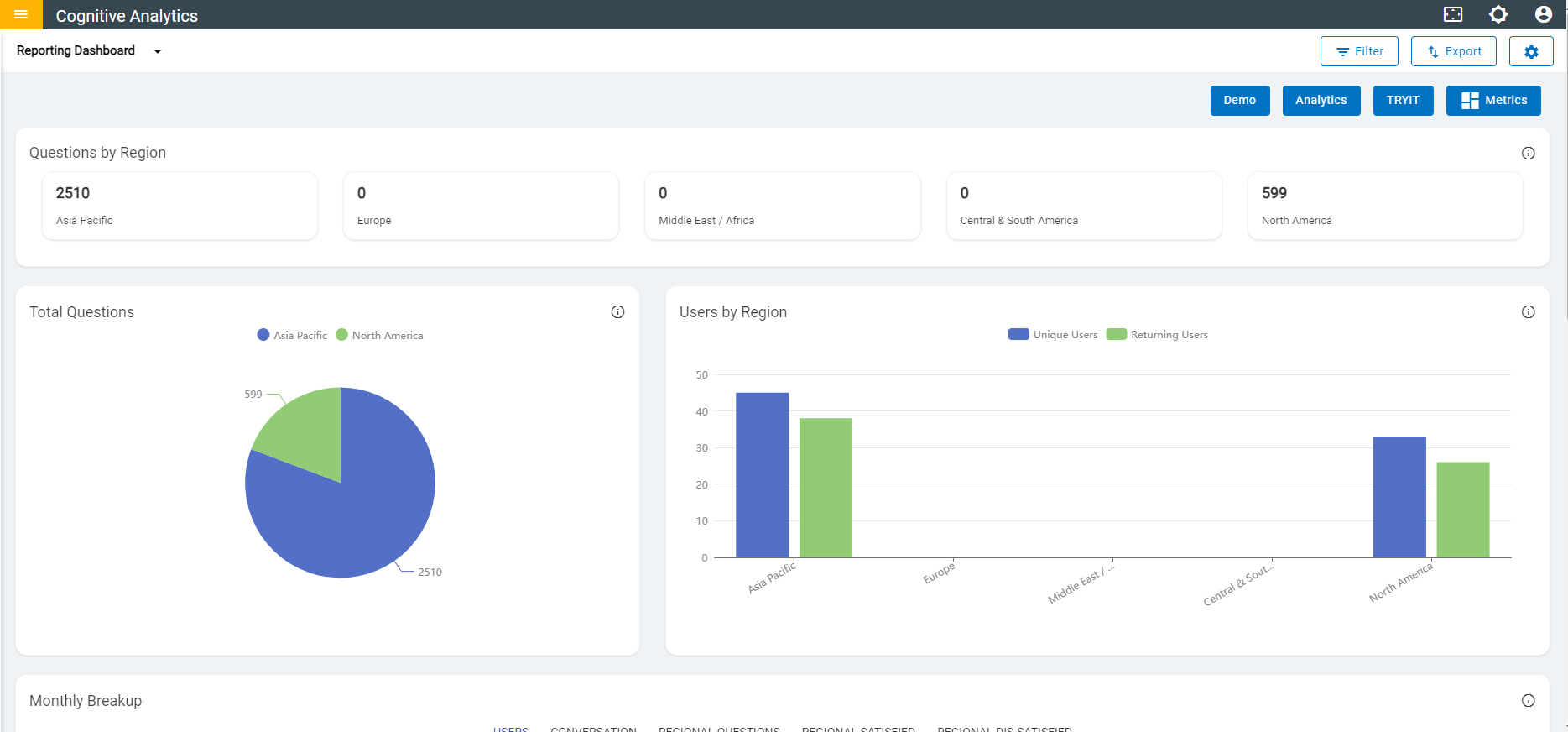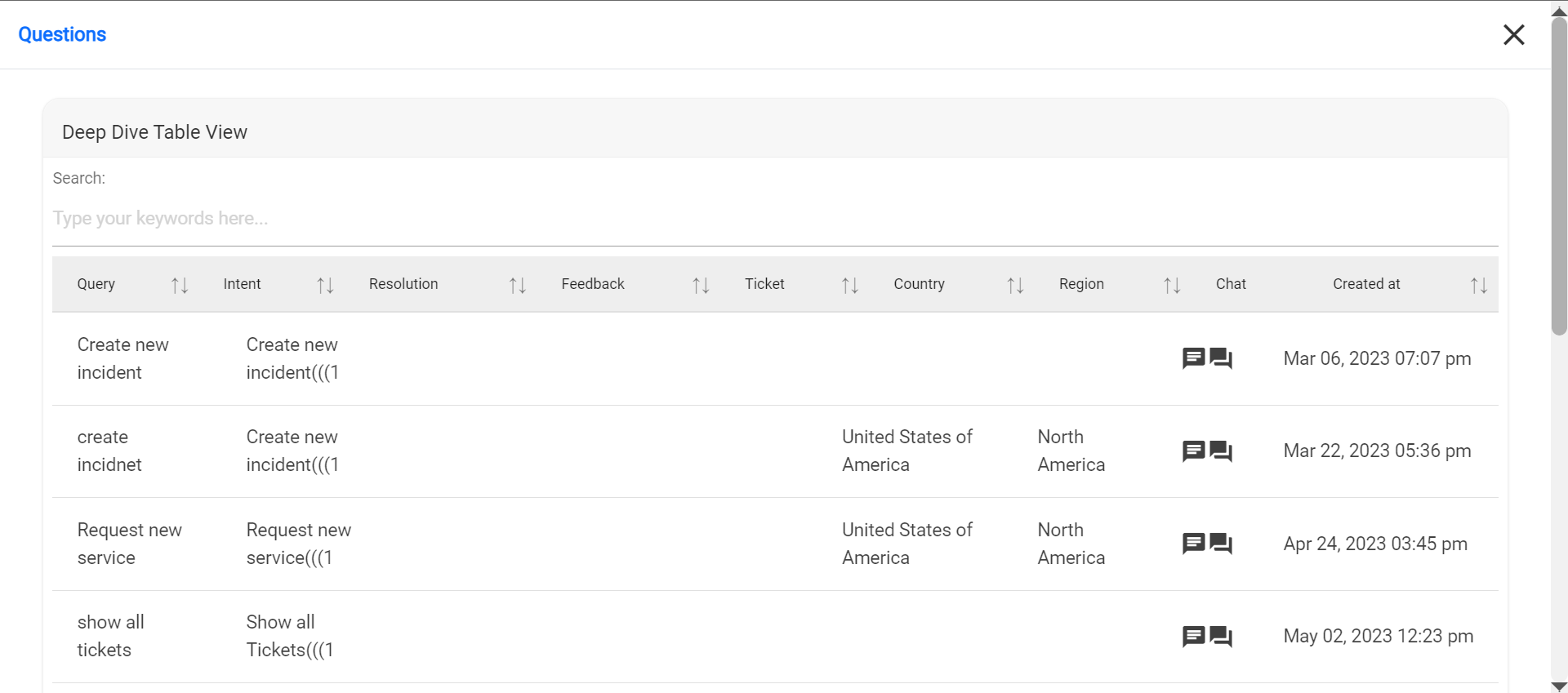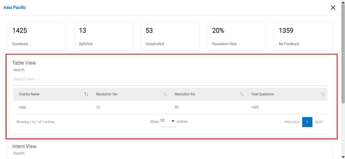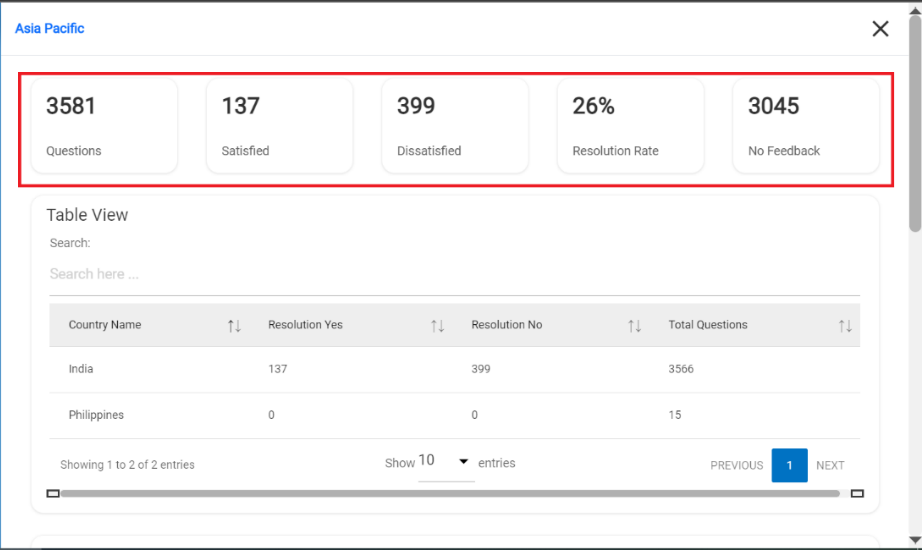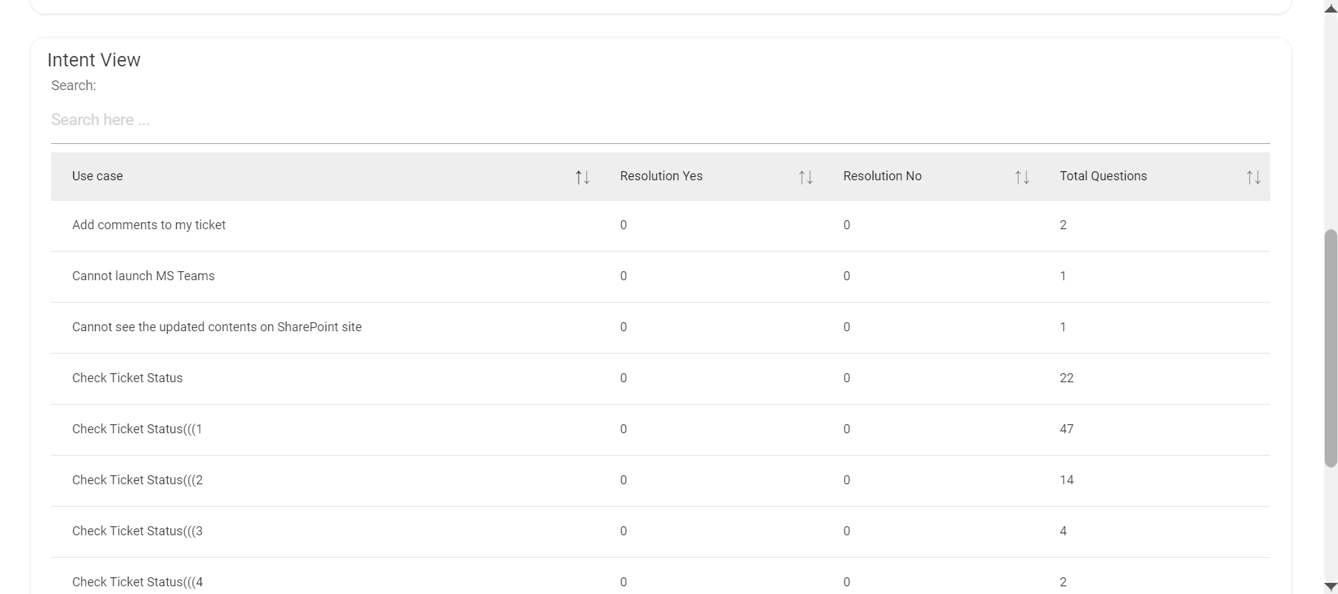 - Frequently Asked Questions: Table represents the list of Usecases along with the total count of Total Questions, Feedback as Satisfied (Resolution Yes) and Feedback as Dissatisfied (Resolution No).