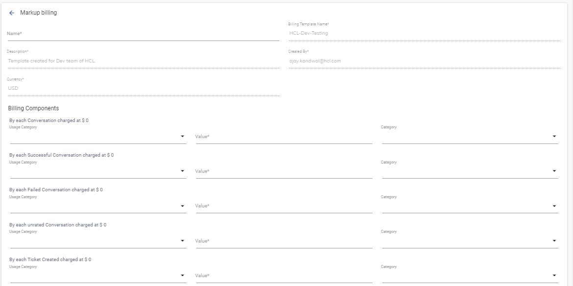 Note:The main billing template is created by the Super Admin SPOC, and the markup billing template is created by the Provider SPOC. - To add markup on the existing bill of a tenant, use