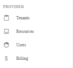 Providers This section describes how a provider can manage the tenants and billing. This can be accessed by both super admins and provider SPOCs. It includes the following sub-sections: Tenants Users Billing Resources Figure 1. Providers