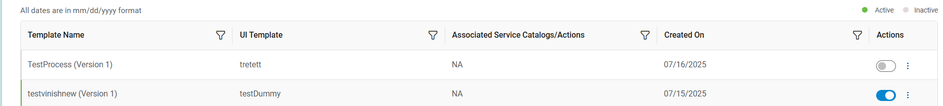 Figure 3. Configured process templates list down in a tabular view: