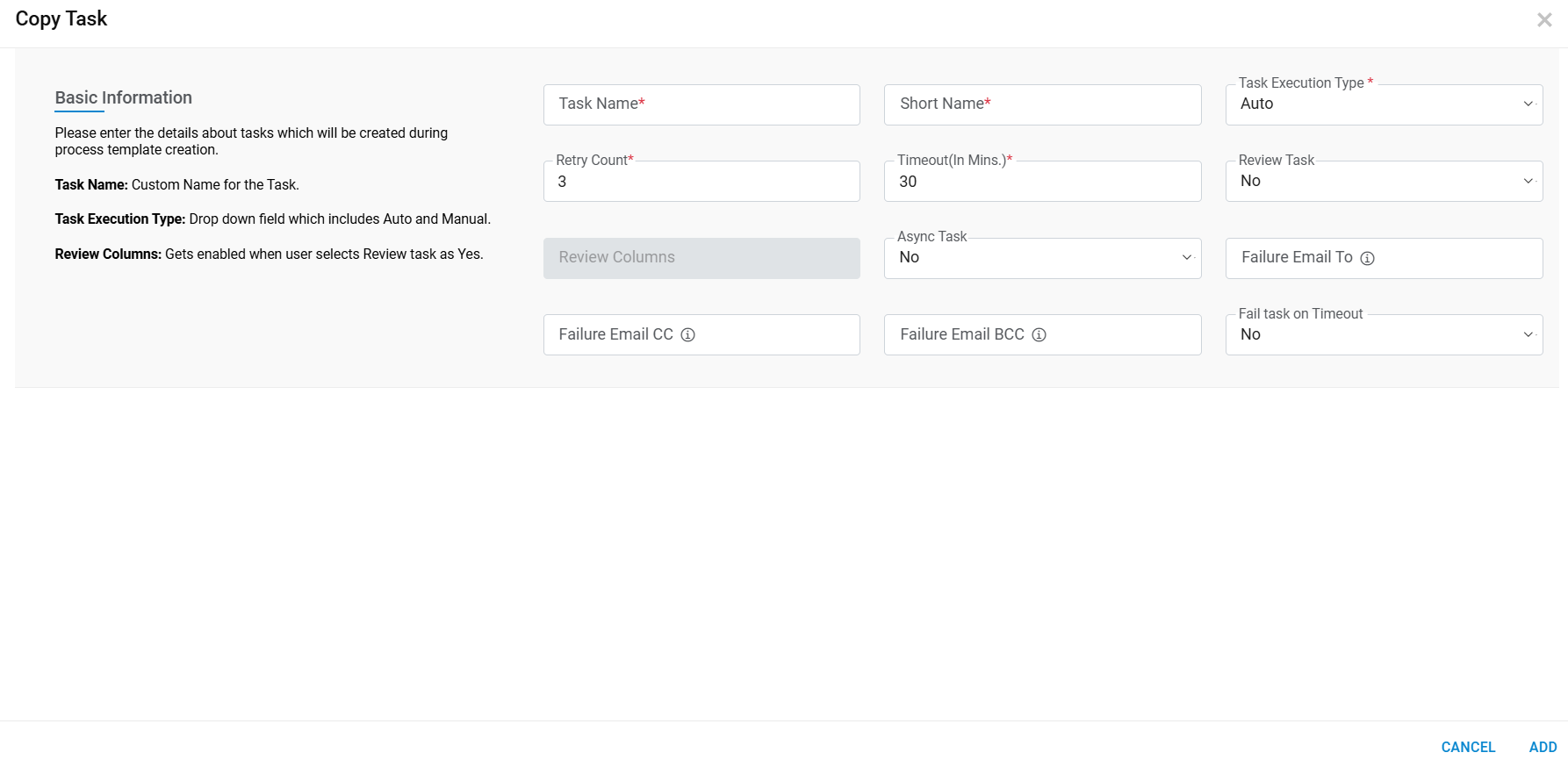 Retry Count Number of times a task will be retried for execution upon getting failed. Timeout (In Mins) Time limit before the task becomes inactive. Review Task In Process Workflow if user wants UI Templates columns to be reviewed before marking that task as completed, user can opt for Review Task option and Mark the columns to be reviewed. In Request Task Tracking Report user can validate the Pending Review task