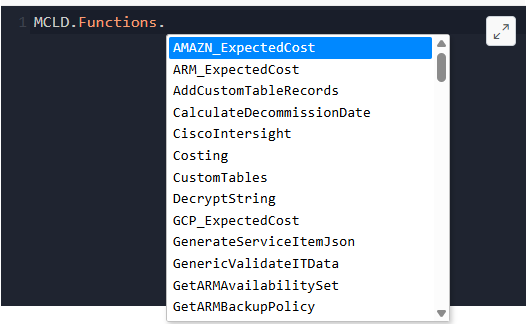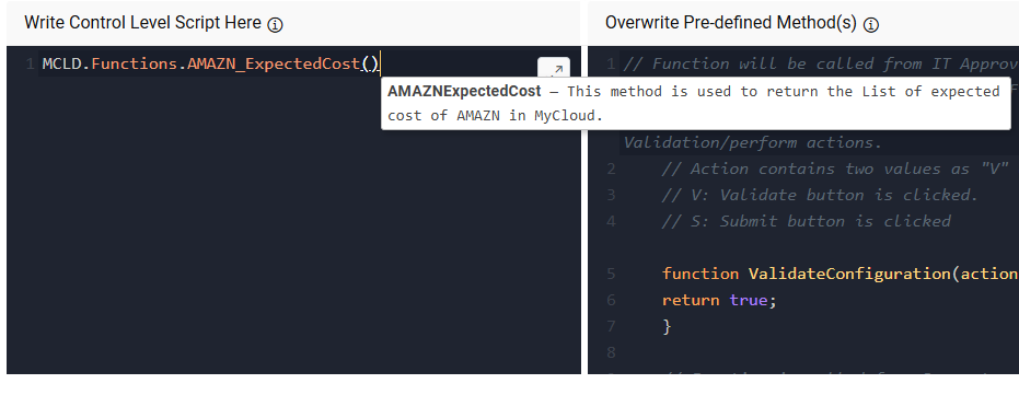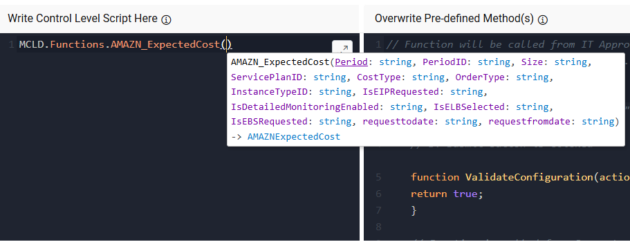 Whenever you want to use a function, for example, if you want to use AMAZN_ExpectedCost, then you need to type MCLD.Functions.AMAZN_ExpectedCost in the script block. When you open the function bracket, a popup appears displaying parameters suggestions, as shown in the image below: