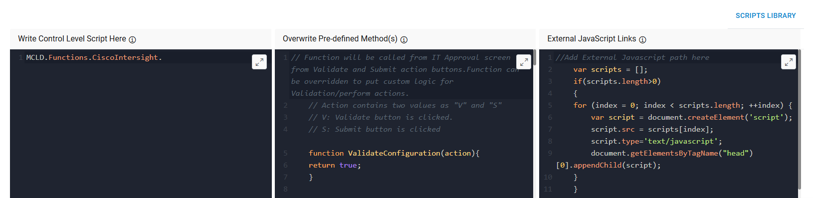 Control Level Script section enables user to access or customize the behavior of controls. If user wishes to override any property or needs to run some business logic, he can write his custom logic using this section. Start-up scripts like “document.ready() “ can be written here.