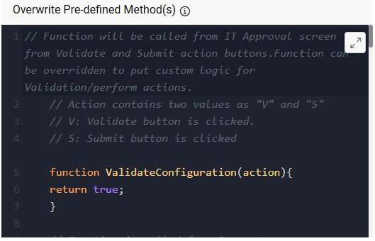 This function will be called from IT Approval screen by clicking, Validate and Submit action. The method is overridden to put custom logic for Validation/perform actions. Action contains two values as "V" and "S" V: Validate button is clicked. S: Submit button is clicked To validate the form use “GenericValidateITData” method for Action value as “V”. Method: GenericValidateITData(action) It will validate the request and shown all the resource available/demanded status as information popup.