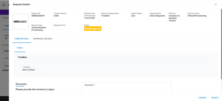 - If required, enter Remarks in remarks box and click Reject.