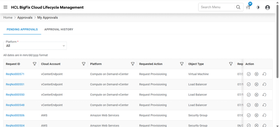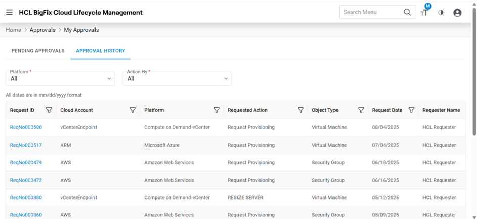 Table 7. My Approval History Fields Description Request No ID of the request created Requester Name Name of the requester who has placed the request. Request Date Date on which the request has been created Approval Date Date on which the request has been approved. Approved By IT Admin who has approved the request Platform Name Name of Cloud service providers - Click on Request No..