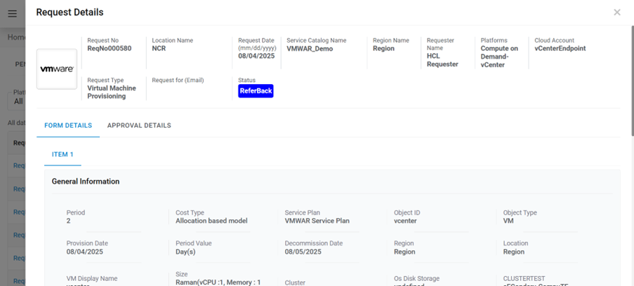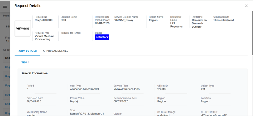 - Raise Action Requests: To raise an Action Request on the requested Resource kindly refer to Virtual Machines Actions.