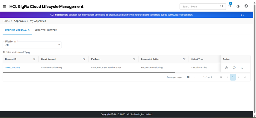 Table 5. IT Approval Fields Description Platform Name of Cloud service providers Object Type Displays the type of the infrastructure resource Request Number ID of the Service request Requester Name Name of the person who has created the request Request Date Date on which the request has been created Platform Name of Cloud service providers Entity Type Code Code of the Cloud service providers Item No Item number of the request Computer Name Name of the computer Approve Action Button – To approve the Resource Provisioning Action It allows the user to take actions. Only those actions will be listed on this screen for which Provider admin has marked “IT Verification Enabled”