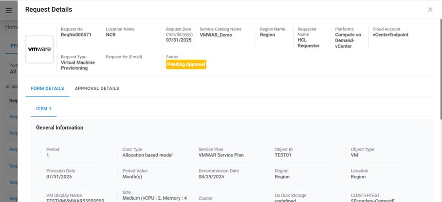 Table 2. My Pending Approval Fields Description Provision Date Date on which resource has been requested Period The lease period for which a resource is required Period Value Time period for the selected resource i.e., months, days, weeks, or years Region Lists the Geographical presence of native cloud providers Location Data center location associated with request Service Plan Resource category created by the provider i.e., platinum, gold, or bronze Cost Type Cost model as Pay as you go, or allocation based VM Display Name Name to be displayed against the Resource being created Remarks Additional information provided by the requester Size Compute the size of requested resource Cluster List the vCenter cluster Storage List the data stores associated with clusters Network Lists of the network associated with cluster Remarks Provide the additional requests if any