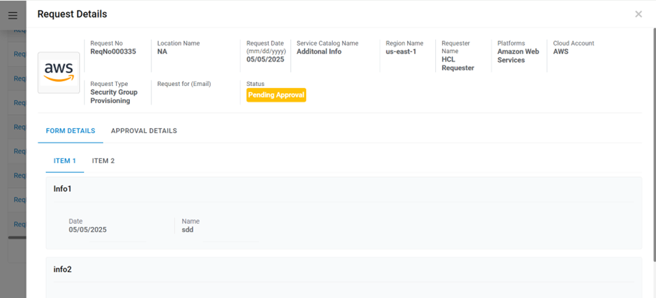 Table 3. My Approval History Fields Description Request ID ID of the request created Cloud Account Name of environment (cloud endpoint). Platform Name of Cloud service providers Requested Action Action requested by requester Object Type Type of the infrastructure resource Request Date Date on which the request has been created Requester Name Name of the person who has created the request Approval Stage Describe the name of the Approval Stage on which Approval is provided Approval Date Date on which Approval is provided Status Status of the request (username of approval) - Click on Request ID.