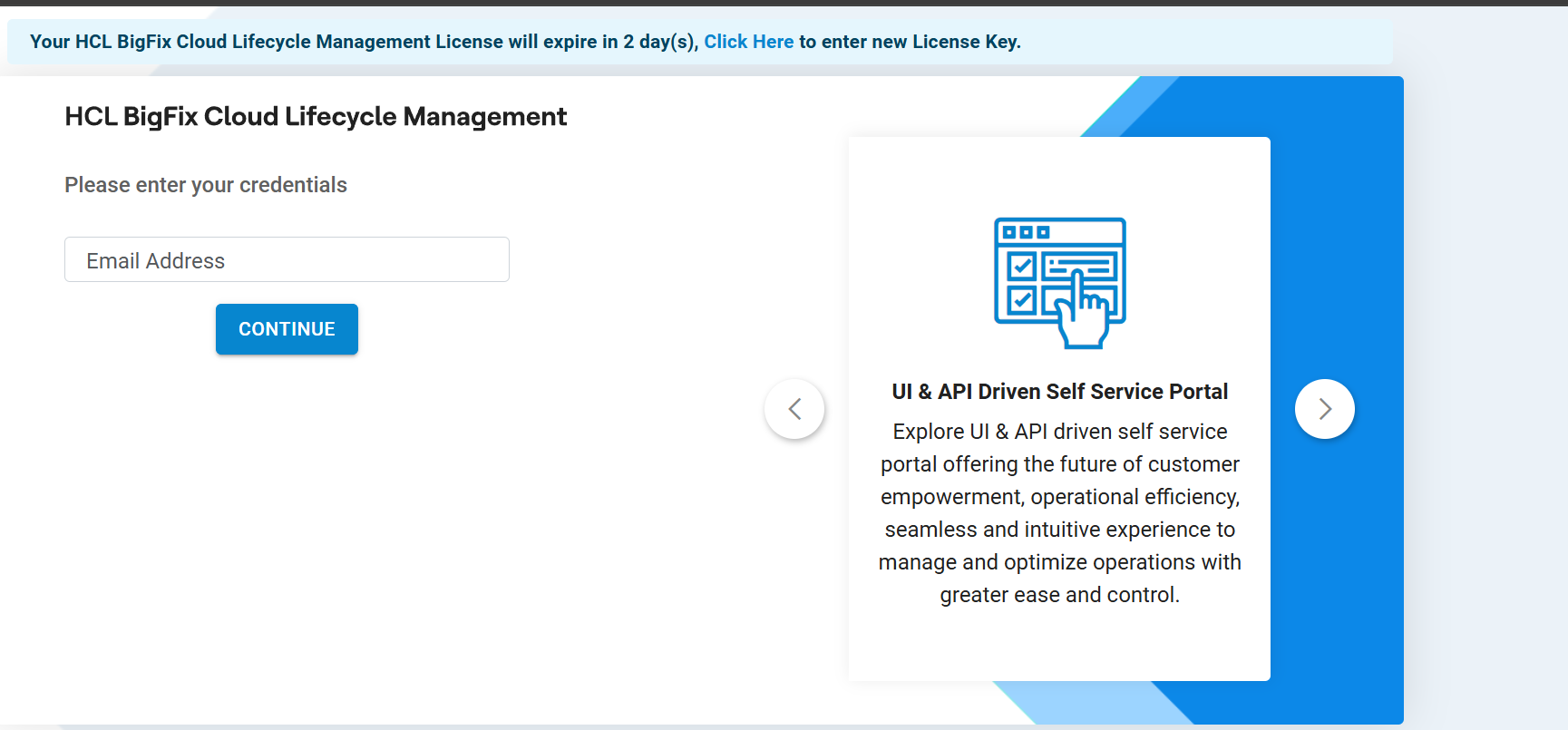 - Launch a web browser (Chrome, Mozilla, or Edge) and use the HCL BigFix CLM URL and User credentials to login to the system.