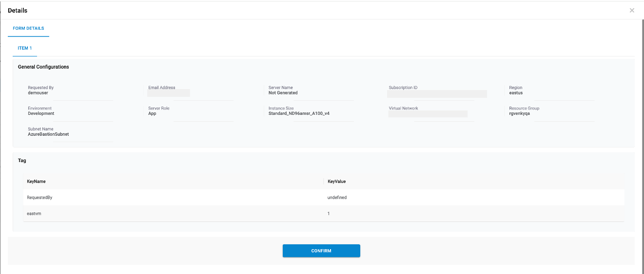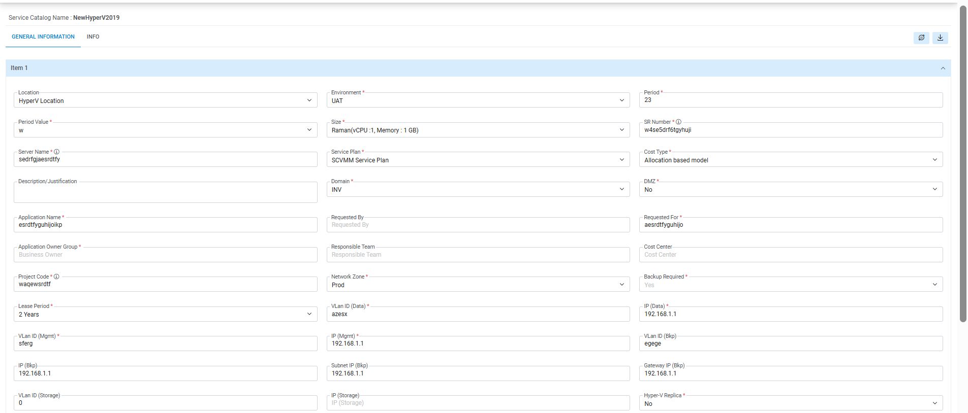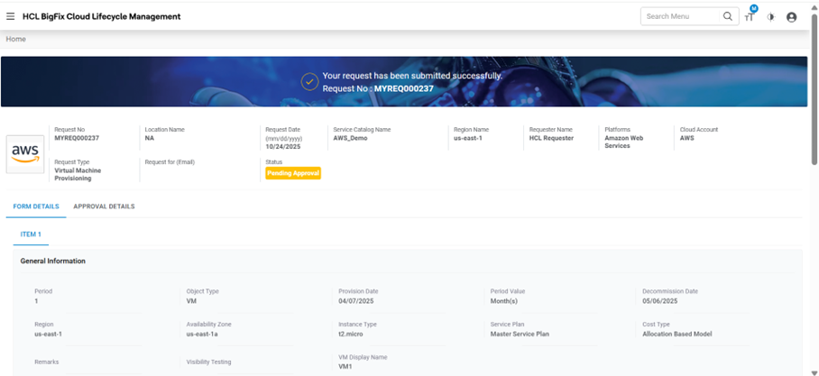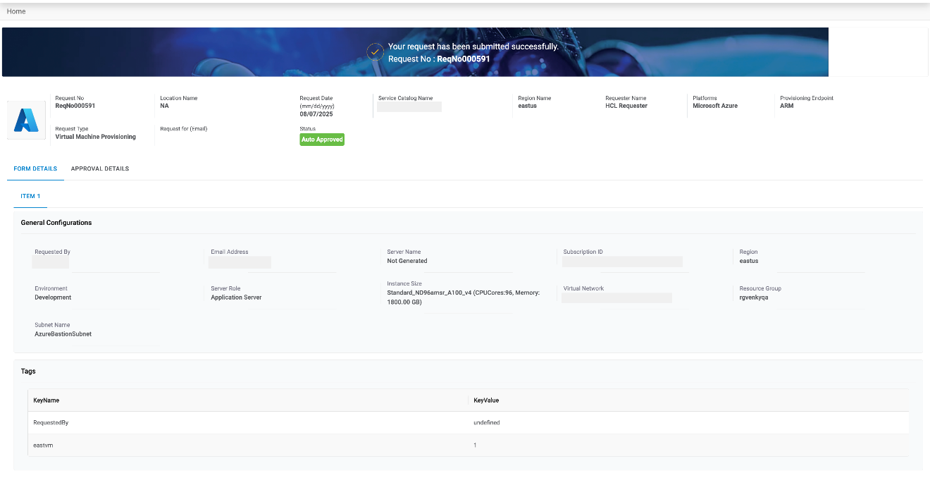 - This displays the Request Form associated with the service catalog to fill in the Information.