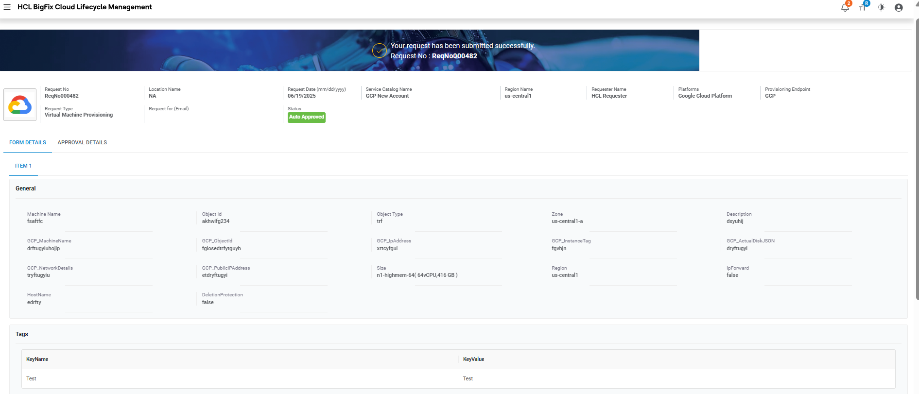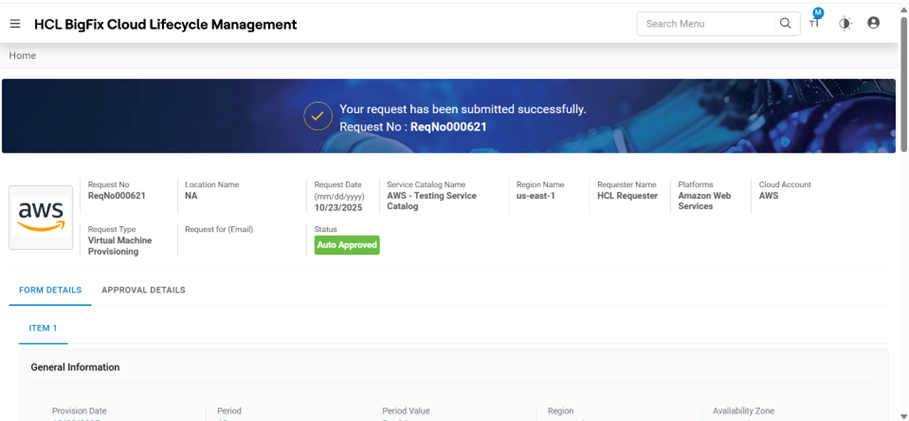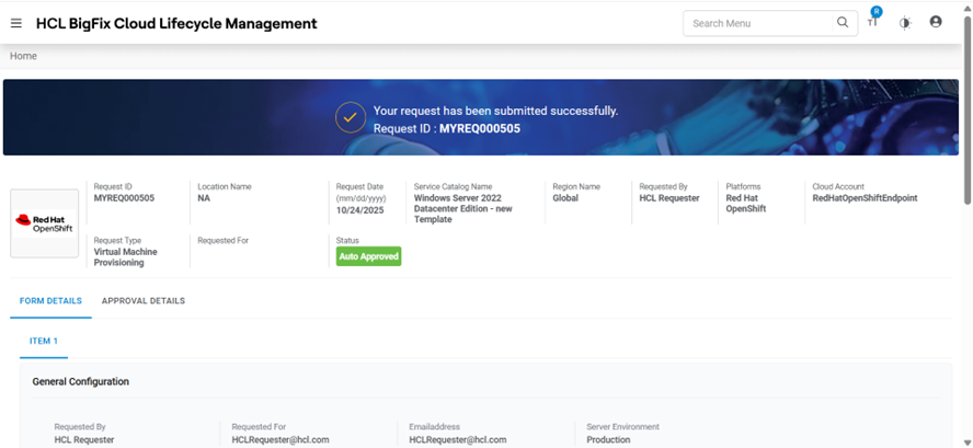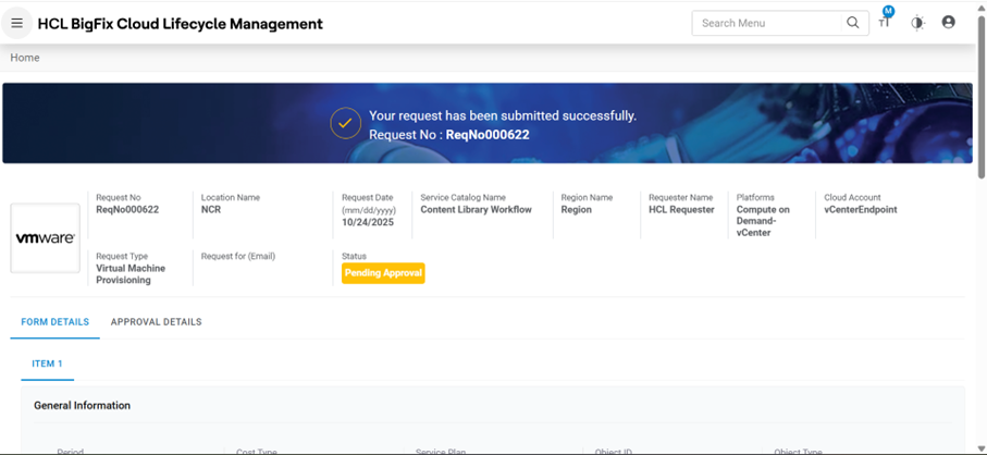 Table 1. Approval History Field Description Request ID ID generated after submitting the request Date Approval date gets displayed post approver’s action. Status Status of the request placed Note:All fields marked with an asterisk (*) are mandatory. - Requests are placed successfully.