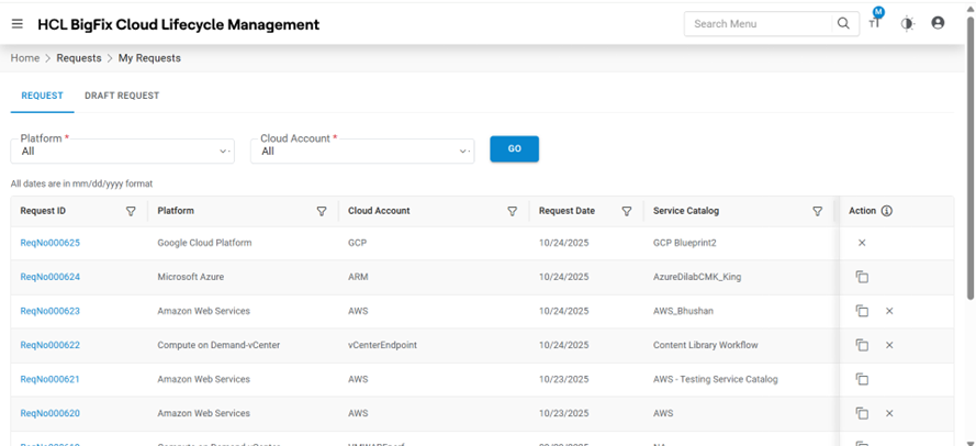 | Action | It allows the user to take actions like Edit, Cancel the request and Clone Request |
