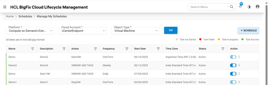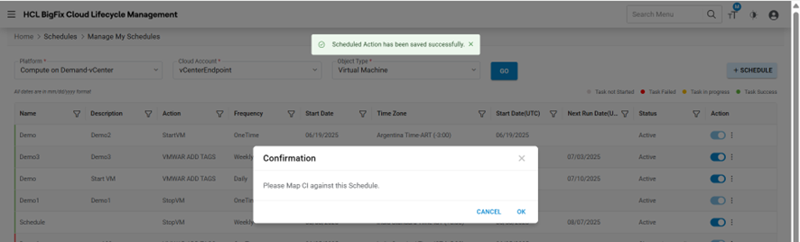 | Action | User to take actions like Edit, Change Status, Map Objects, history, Delete against the listed schedules |