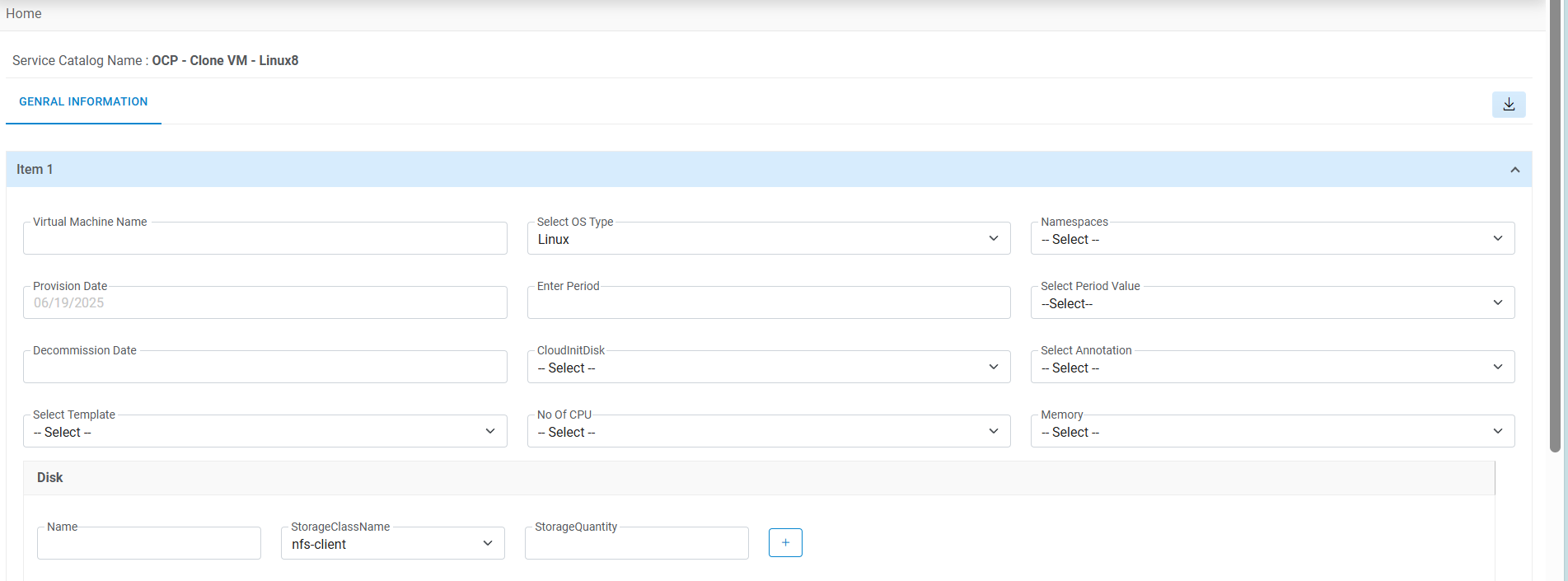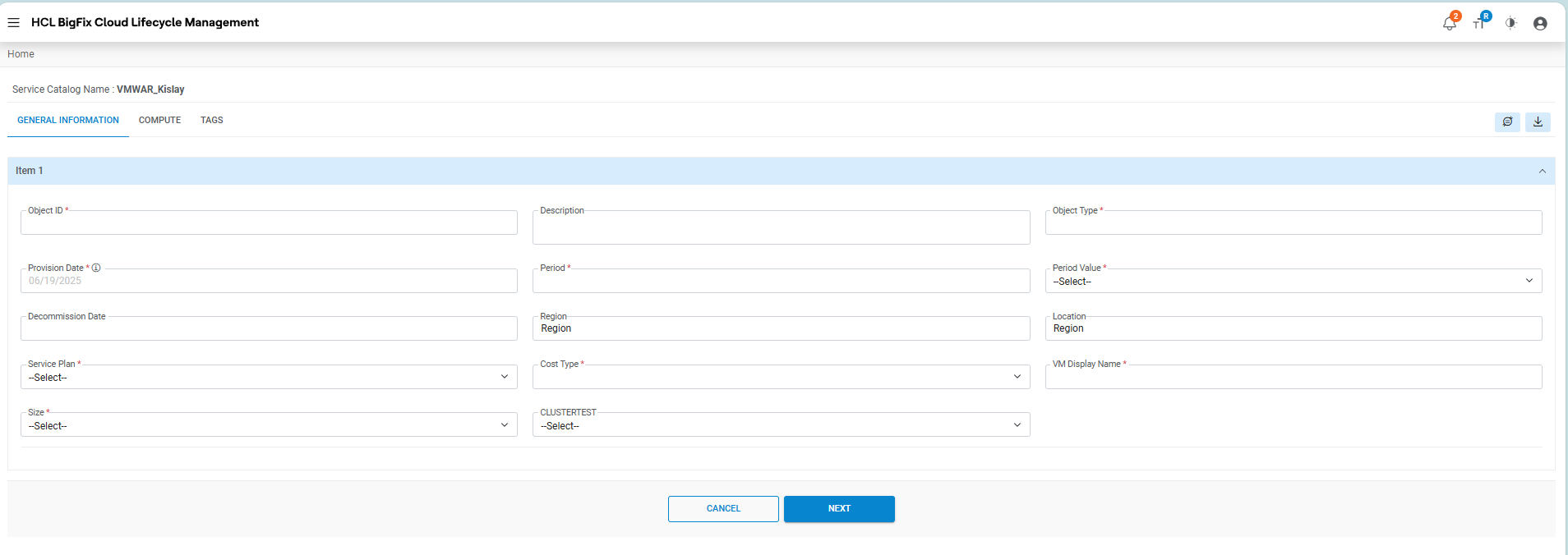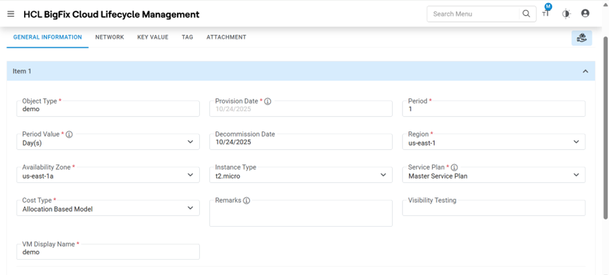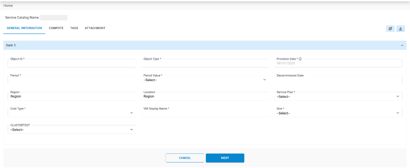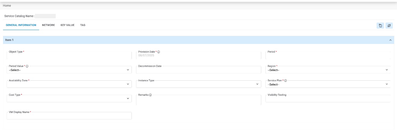 - The request service catalog form appears.Note:This is a sample request form for Machine Provisioning. The form, tabs, UI fields may vary depending on the Catalog selection and as per configuration done by provider admin.