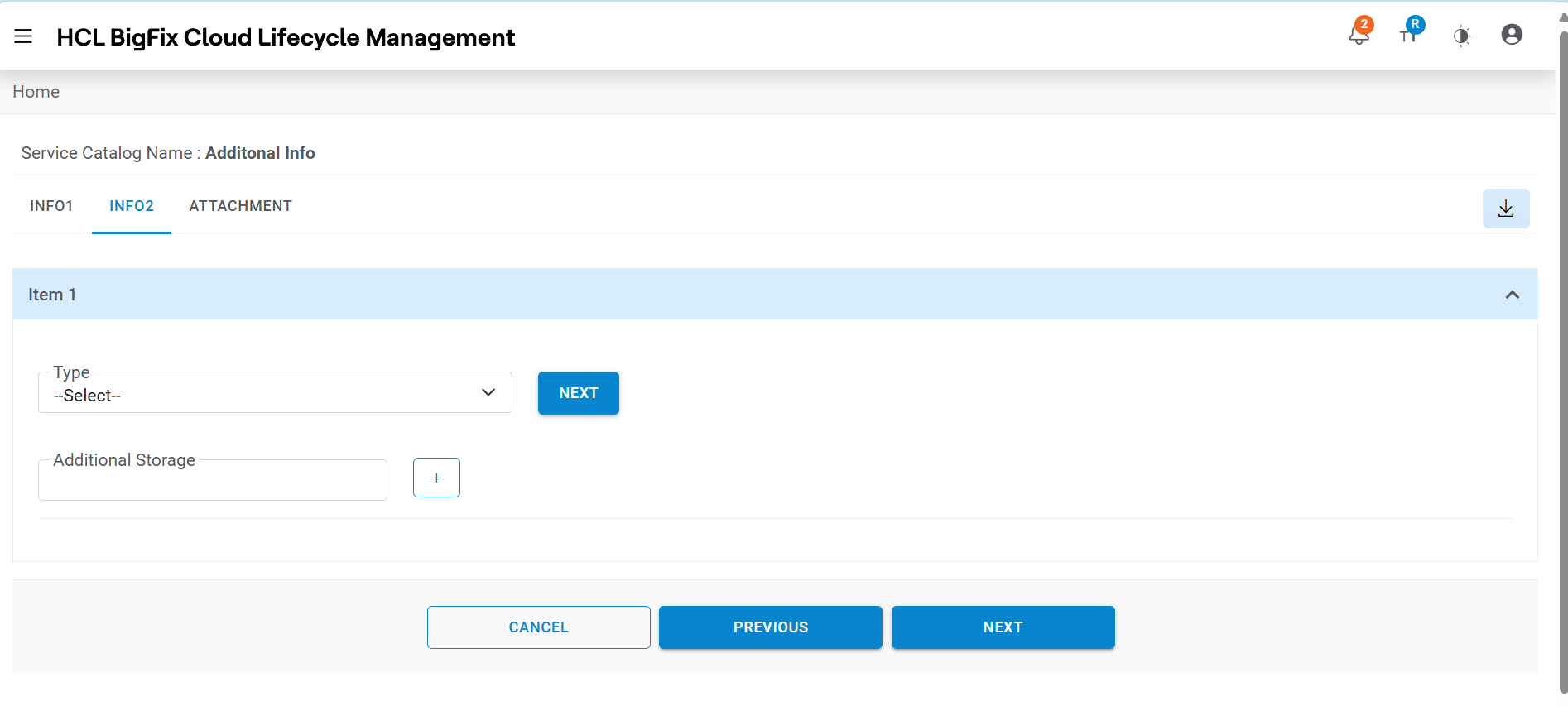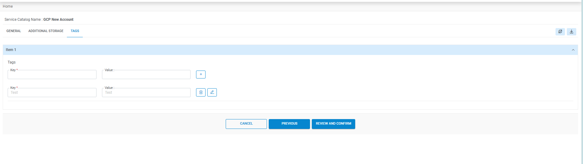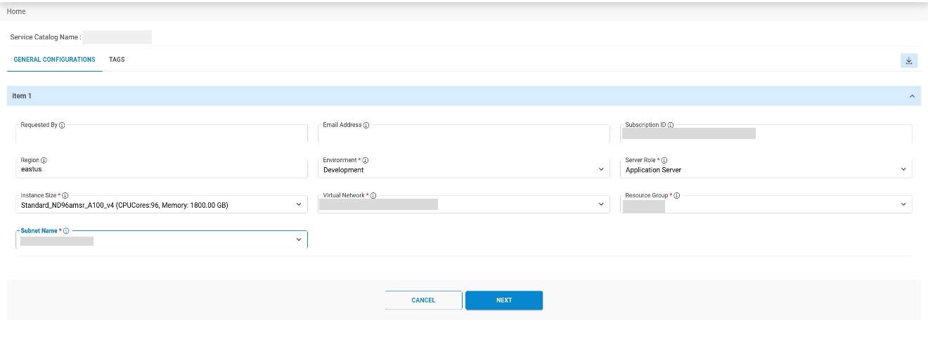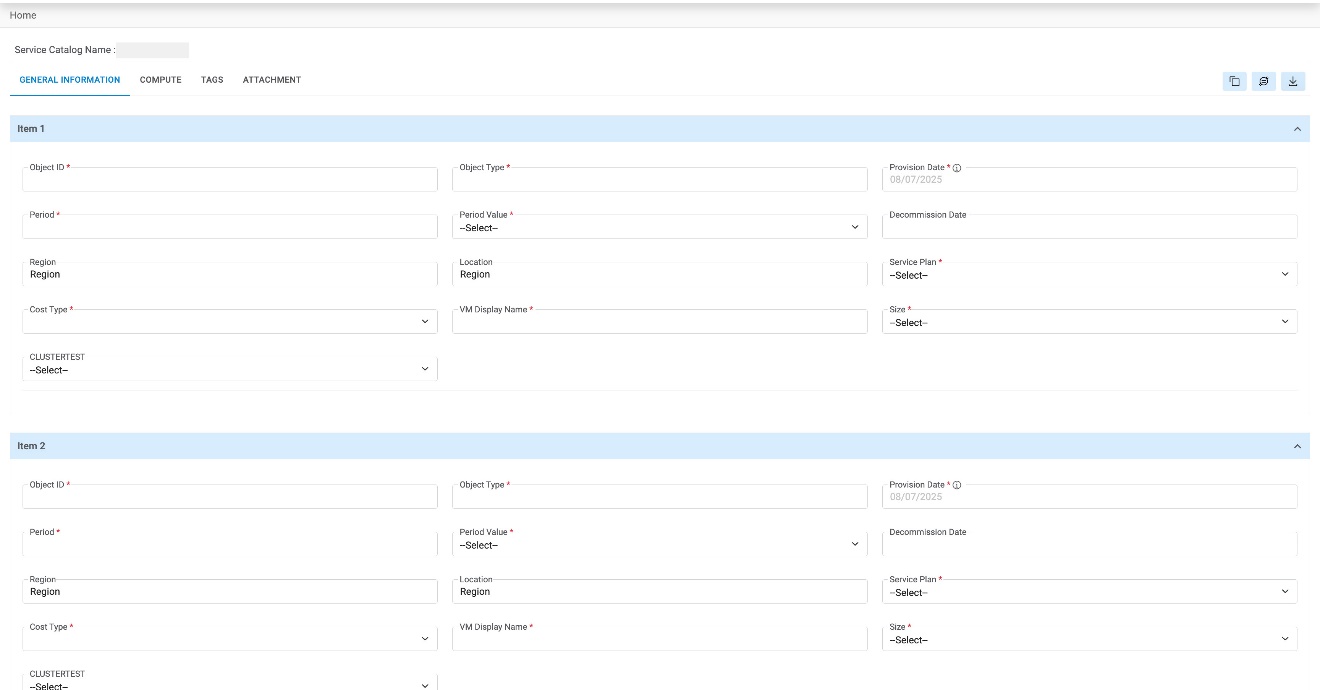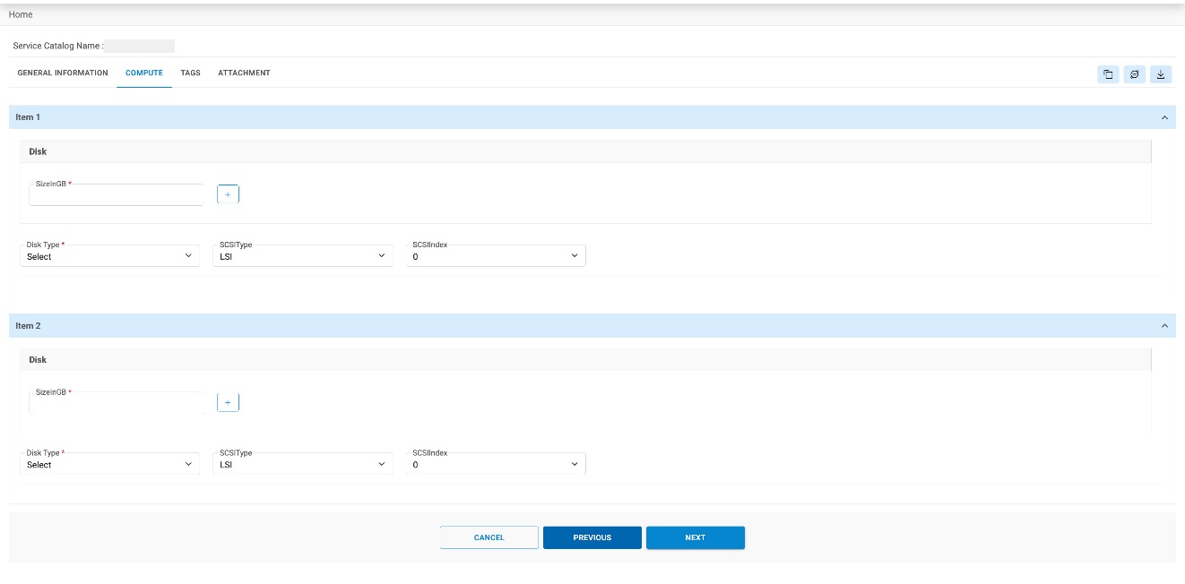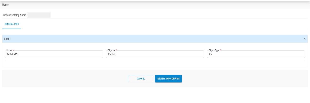 - On Service Catalogs page, Select the following fields: