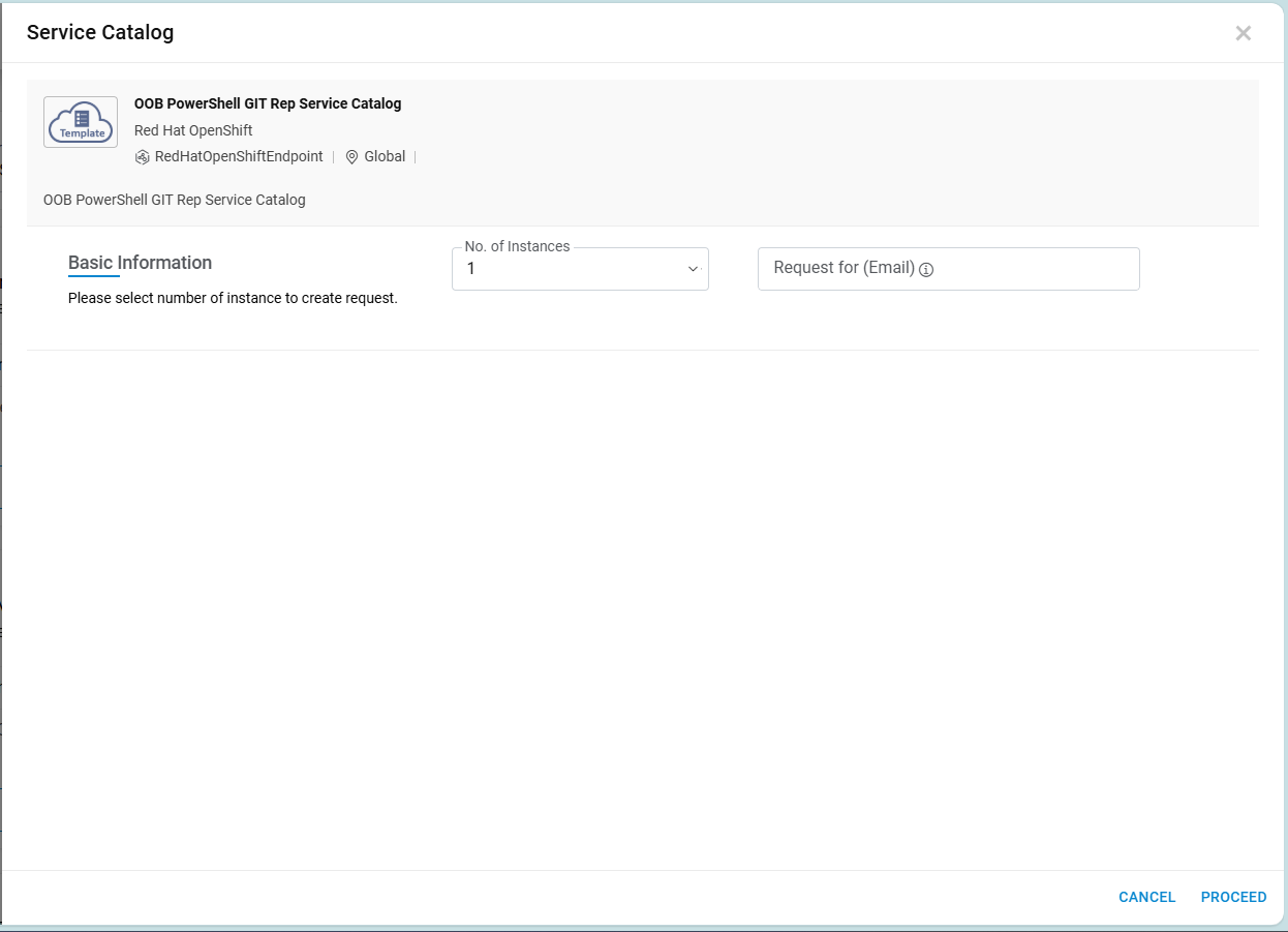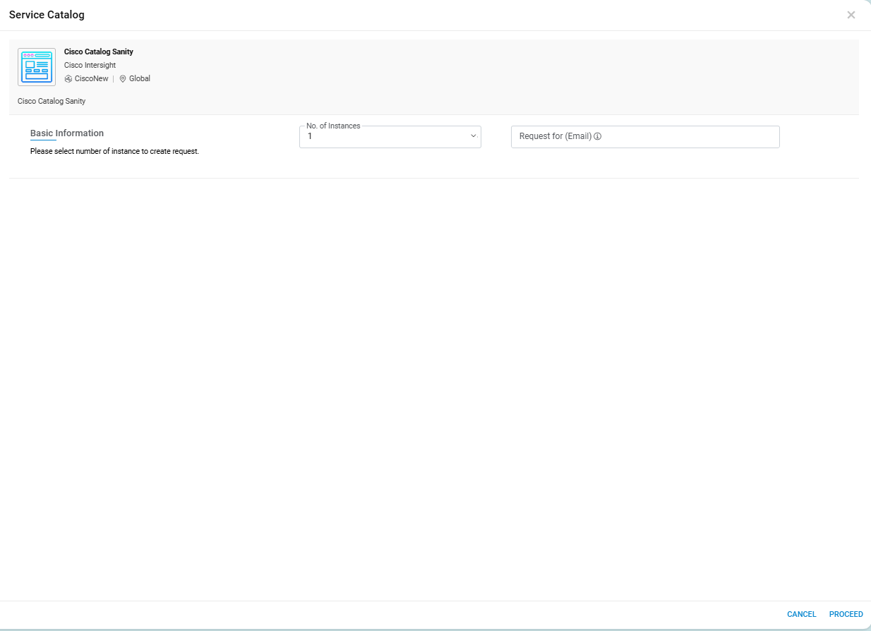 Proceed.If provider enabled “Request For” option in service catalog, then “Request For (Email)" option will be visible to requester user to place request on the behalf of other user in same organization.