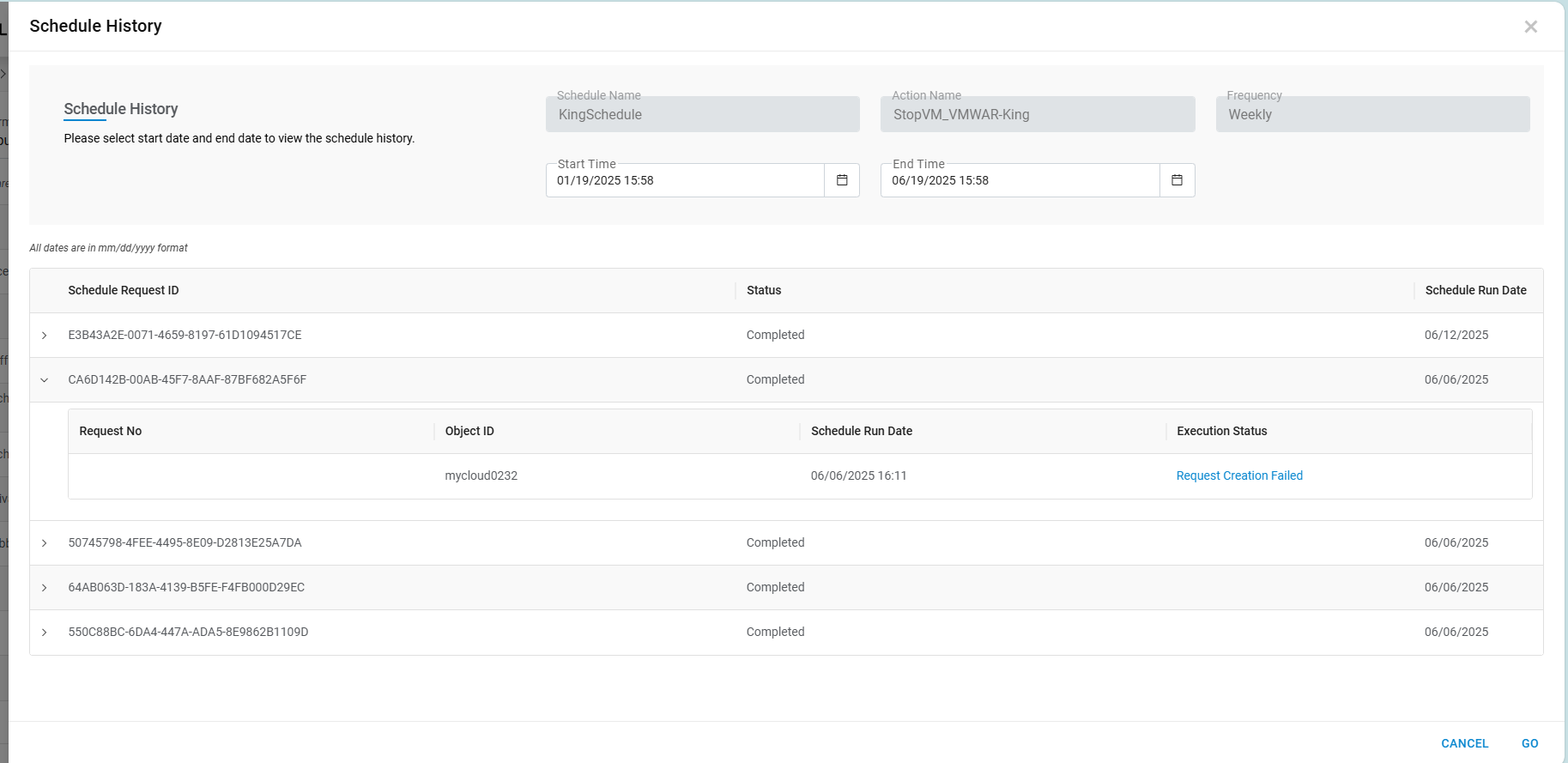 | Start Date | Start Time, to filter the history of Schedules from this time |