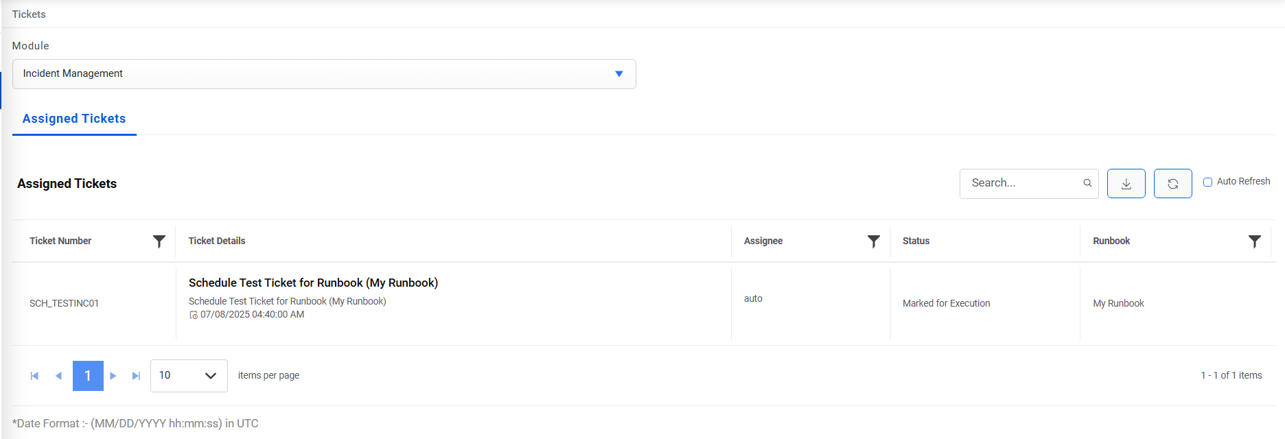 Go to the Tickets menu and see that a ticket is created with prefix ‘SCH_TEST’. Based on the execution of this test ticket, the user can proceed for approval/rejection of the runbook.