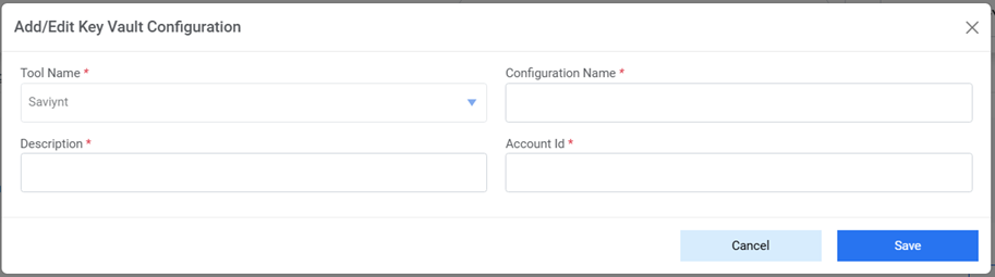 - For tool name as Saviynt, the below popup opens when clicked on 'New Key Vault’