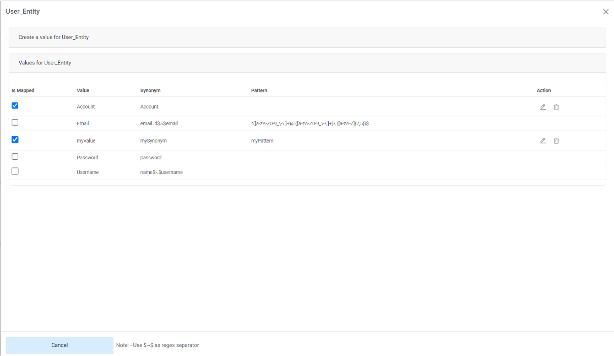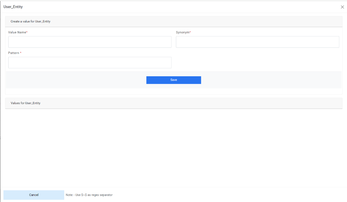 - A page appears for you to type the Value Name, Synonym, and Pattern (or regular expression).