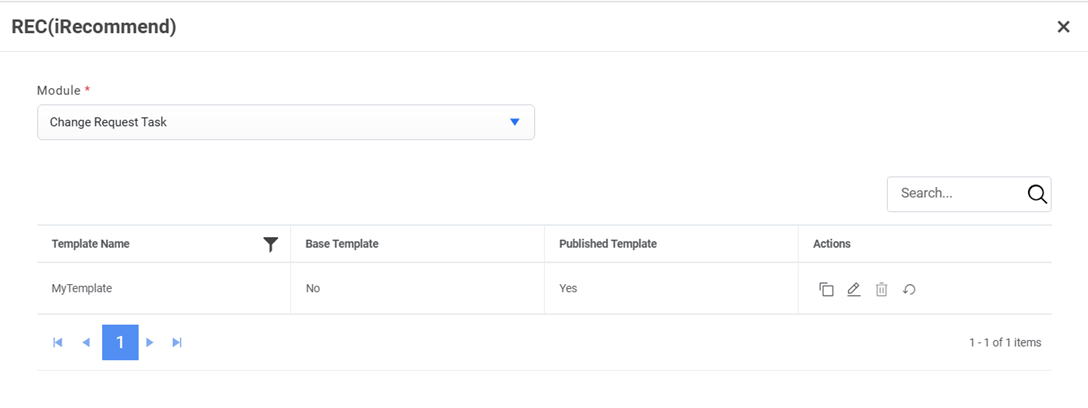 This lists the default base template and existing templates for the selected component if there are any. These templates provide a starting point for users to create a template by replicating or cloning them. It also enables a user to edit or delete the existing templates.