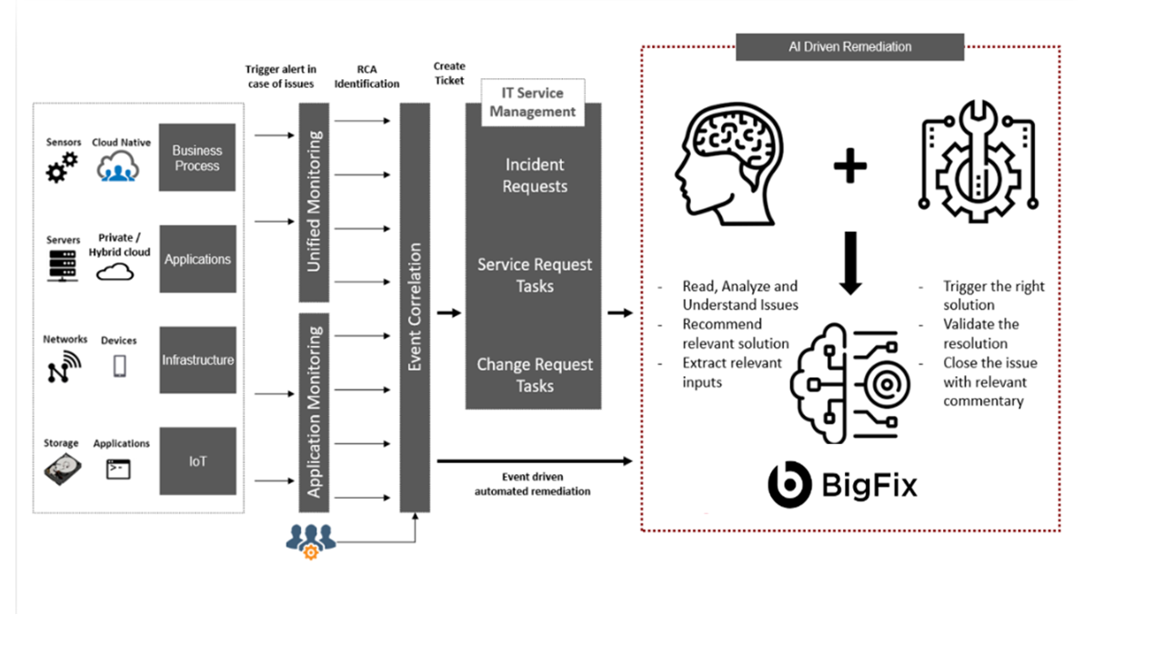 BigFix Runbook AI is an Intelligent Runbook Automation product which is equipped with Artificial Intelligence, Machine Learning and Natural Language Processing capabilities for simplifying and automating the IT Operations issues resolution lifecycle including incidents, service request tasks, change request tasks and events. It leverages its NLP capabilities for analyzing and understanding the context of a specific issue, recommends the most relevant solution and even triggers the execution, thereby enabling Zero Touch Automated Remediation. It also provides AI-driven Knowledge Recommendation by suggesting relevant knowledge articles from various repositories, both internal and external, as and when required by human agents.
