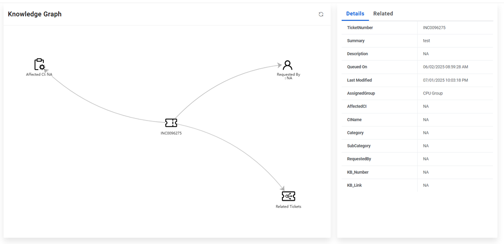 Note:The response received in related articles will be based on the option checked on Google Custom Search for API/ GenAI Studio API details page under GenAI Studio API tab. If Related Knowledge Articles option is checked, data will be visible from GenAI Studio prompt and else it will be visible using internal APIs. - Click on knowledge graph icon, below popup opens. It gives graphical representation of tickets data along with the Affected CI of the ticket, the requested by user name, and the top ten related tickets of the same.