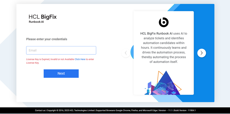 - Launch a web browser and provide HCL BigFix Runbook AI Web Portal URL. The BigFix Runbook AI Login Page appears.