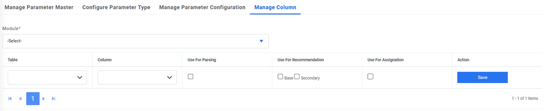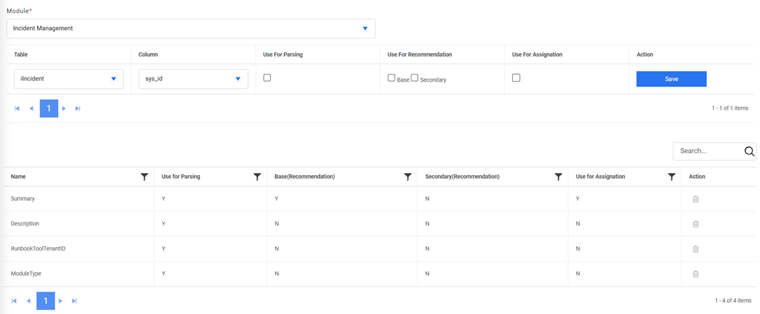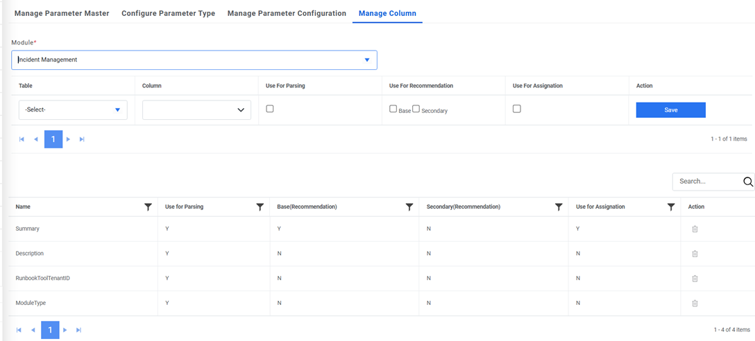 This lists the existing parameters used for parsing and recommendation in a tabular view for the selected organization. Users can also add a new configuration or delete the existing configuration.
