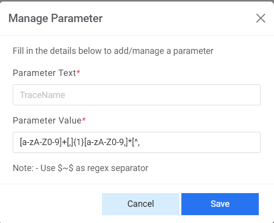 - Parameter Value : This describes the regular expression for a parameter under the selected code.