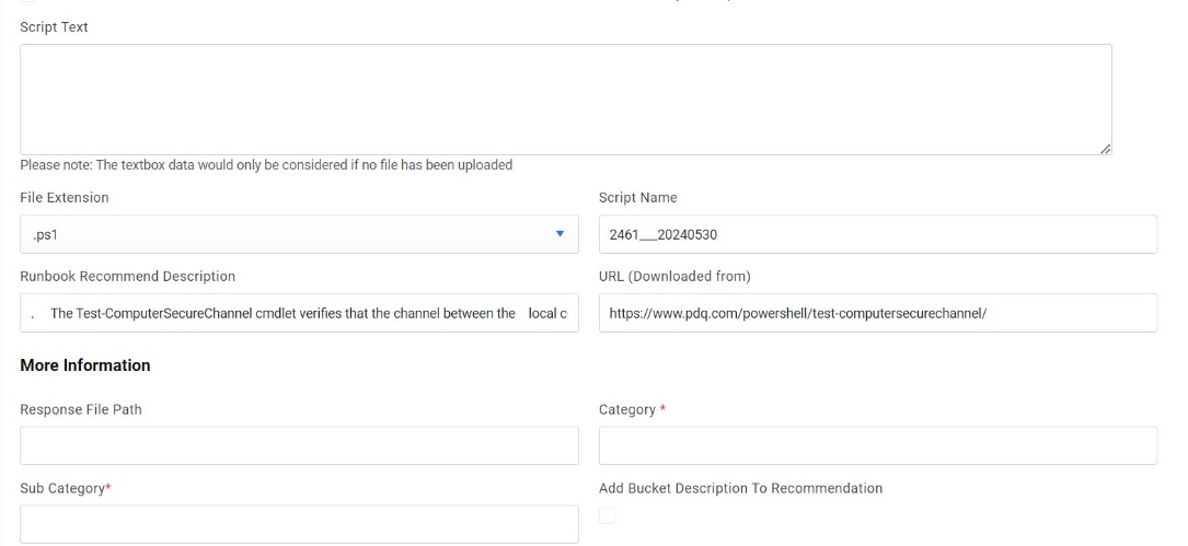 In case of unavailable runbooks for a certain set of ticket categories, BigFix Runbook AI helps the users by automatically downloading relevant scripts from internal and external data sources. Users can view, validate, and customize those scripts for future use.