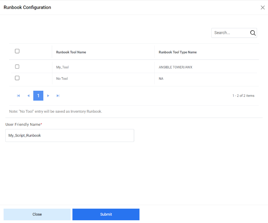 Note:Users cannot edit a script after the analysis is approved.While saving, user can add this created script as a runbook to the runbook tools present in the system by giving a user-friendly name. Then click on Submit. The created script will now be visible under the selected runbook tool.