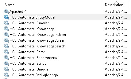 (e.g., “HCL.BigFix Runbook AI.EntityModel”, “HCL.BigFix Runbook AI.iCrawler”, “HCL.BigFix Runbook AI.iKnowledge”, “HCL.BigFix Runbook AI.iKnowledgeIndexer”, “HCL.BigFix Runbook AI.iKnowledgeScreen”, “HCL.BigFix Runbook AI.iKnowledgeSearch”, “HCL.BigFix Runbook AI.iParse”, “HCL.BigFix Runbook AI.iRecommend”, “HCL.BigFix Runbook AI.iScript” , “HCL.BigFix Runbook AI.iUnique”, “HCL.BigFix Runbook AI.RatingMongo”).